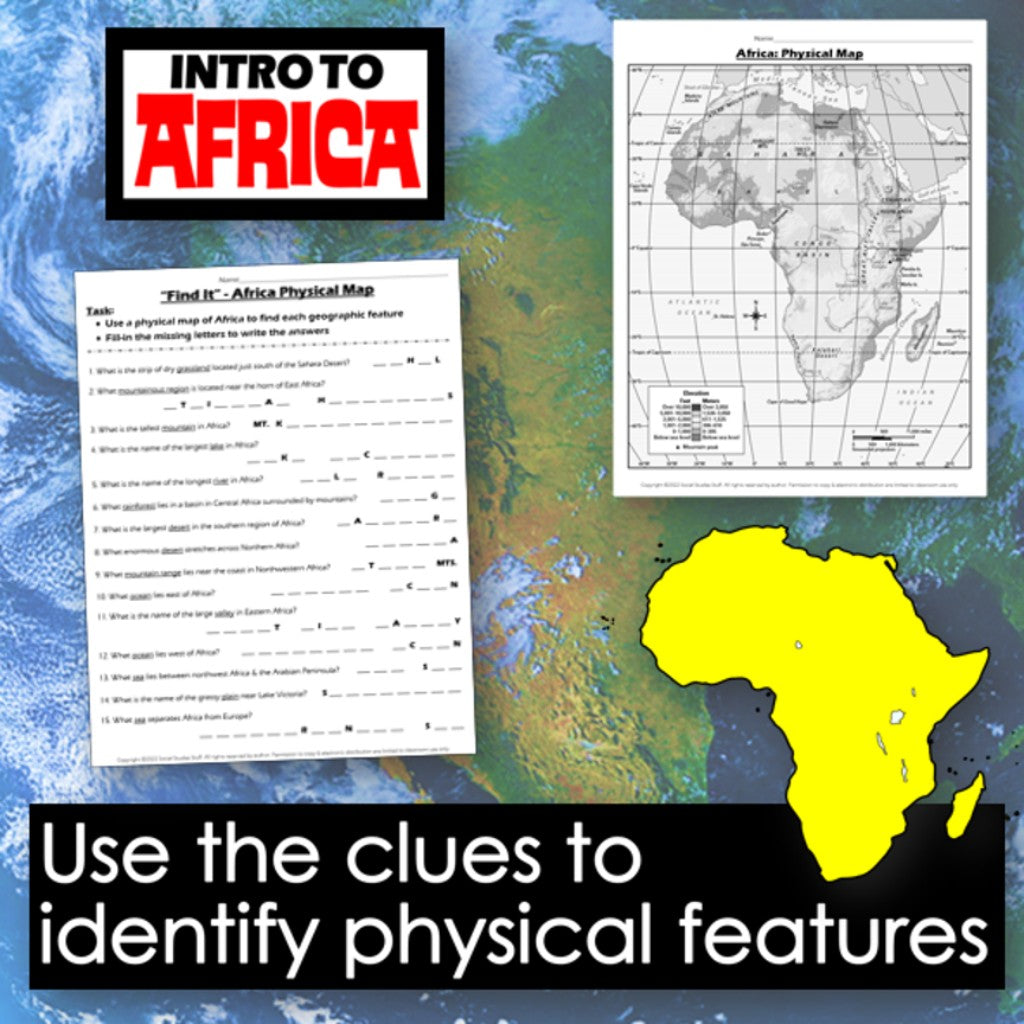 This worksheet challenges students to apply their map skills to identify landforms and physical features on a physical map of Africa. They use clues to identify 15 geographic features on the map and fill in the missing letters. Everything you need is included!