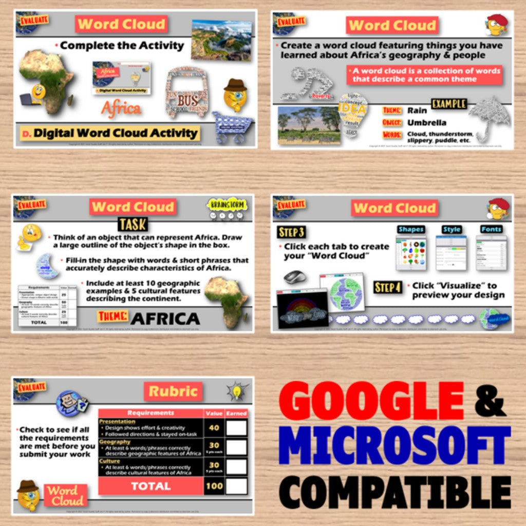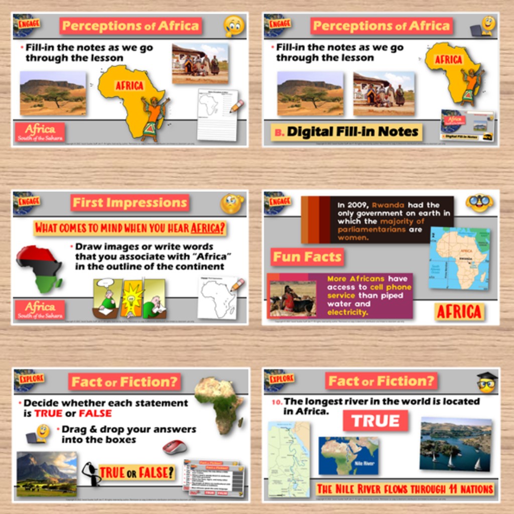 Start with a “First Impressions: Africa” warm-up, followed by a “Fact or Fiction?” activity to debunk common misconceptions about the continent. Fill-in notes accompany the lesson. Next, challenge your class to complete a map investigation that delves into the African cultures and geography. A printable “walk-around” poster version is also included for in-class instruction. Review the key concepts of the lesson with a “MythBusters” summary. Finally, assess learning with a fun, creative “Word Cloud” activity featuring the people and lands of Africa.