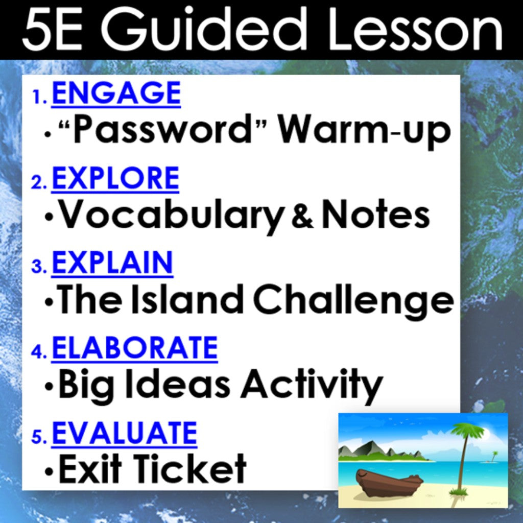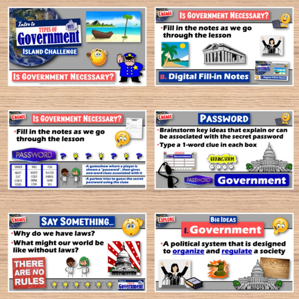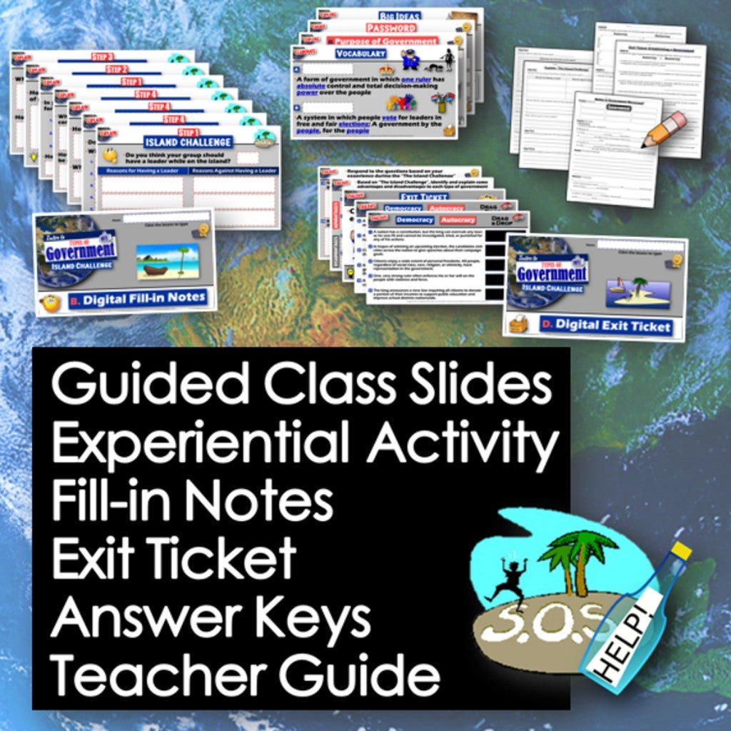 Start with a “Password” warm-up that introduces the concept of “government,” then present key ideas about the role of government in society. Fill-in notes accompany the lesson. Next, the “Island Challenge” allows students to experience the difficulties of establishing a government. As a group of castaways on a deserted island, they must work together to establish a new society and survive. Finally, check for understanding and evaluate learning with an “Exit Ticket” activity.