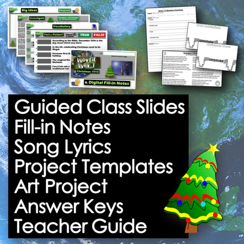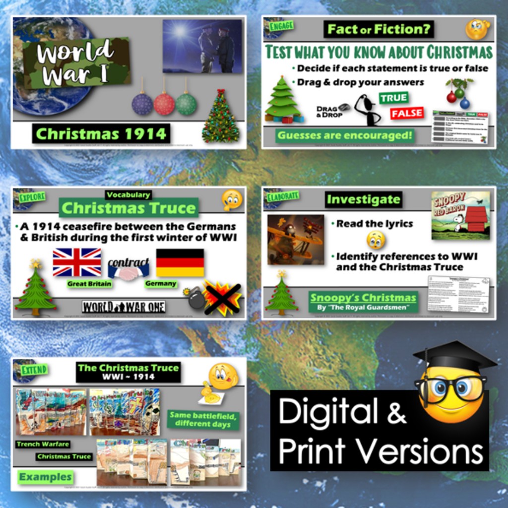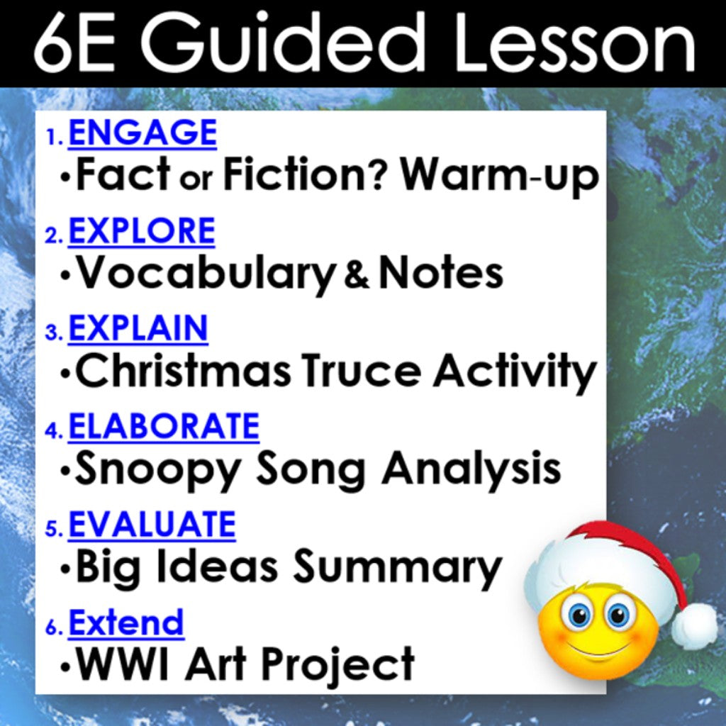 This fun lesson explores the Christmas Truce of 1914, which took place along the WWI frontlines between British and German troops. The activities are engaging for students, and the guided 6-E format is easy for you to use! It helps you connect the Christmas holidays with your history curriculum. Everything you need is included!