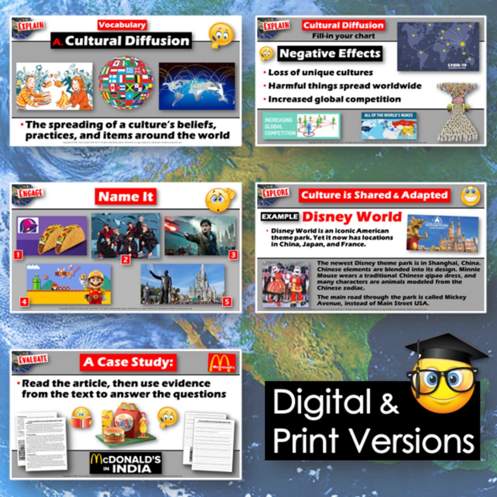 This lesson examines the concept of cultural diffusion and its impact on our world, using McDonald's restaurants as a real-world example. The activities are engaging for students, and the guided 5-E format is easy for you to use! Everything you need is included!