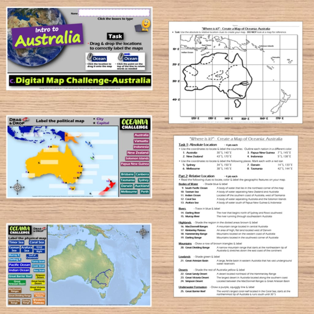 First, students create a map of Australia using only absolute & relative location clues – NO reference maps are needed! Then, they examine various physical and political maps to solve clues about Oceania’s geography. Finally, a drag-and-drop challenge assesses their learning of the countries, landforms, and bodies of water located on the continent.