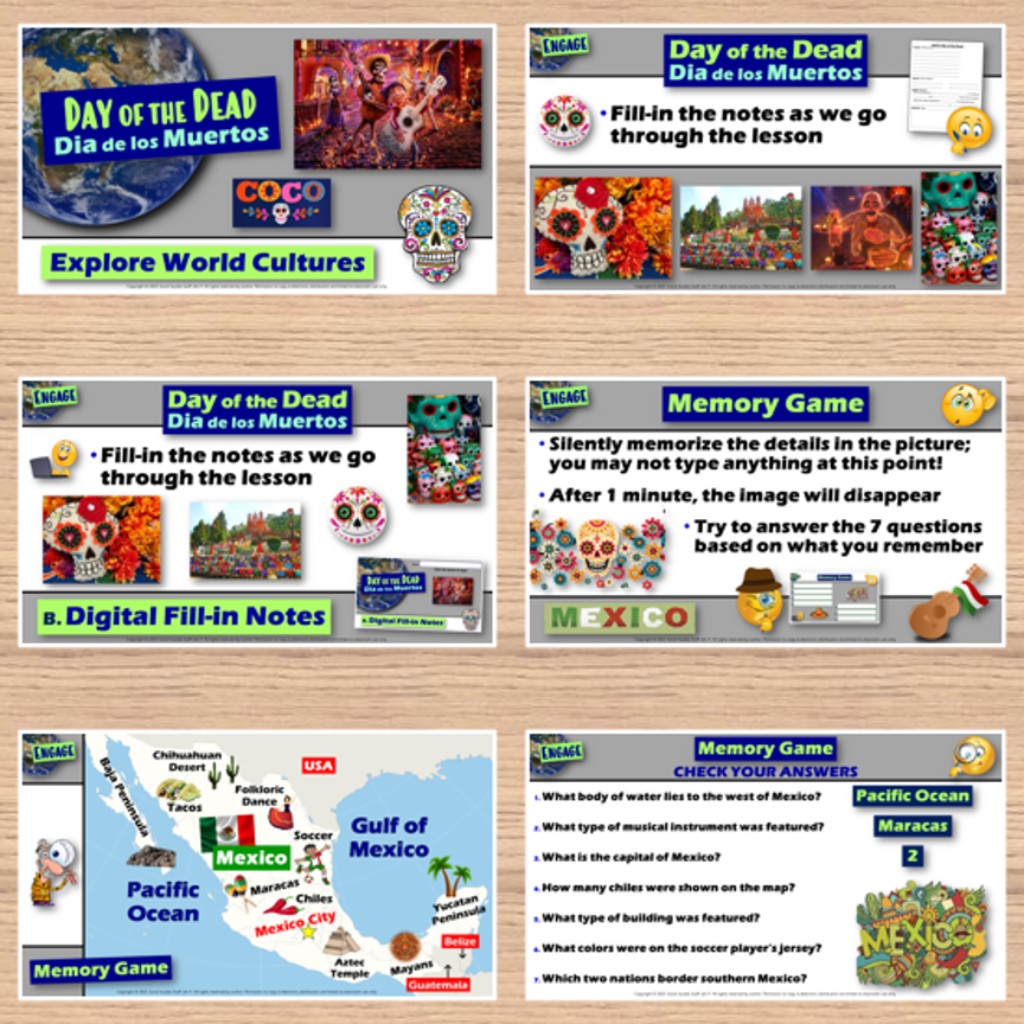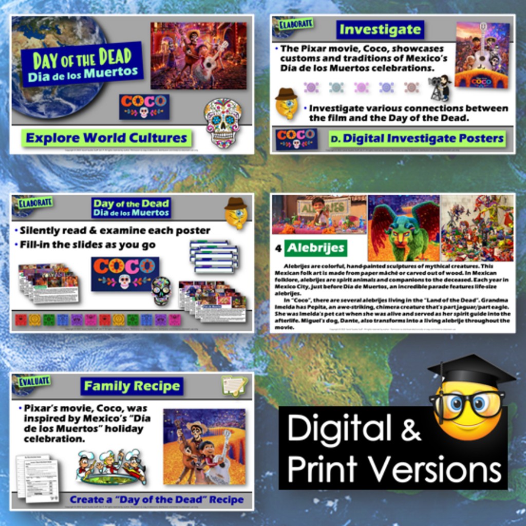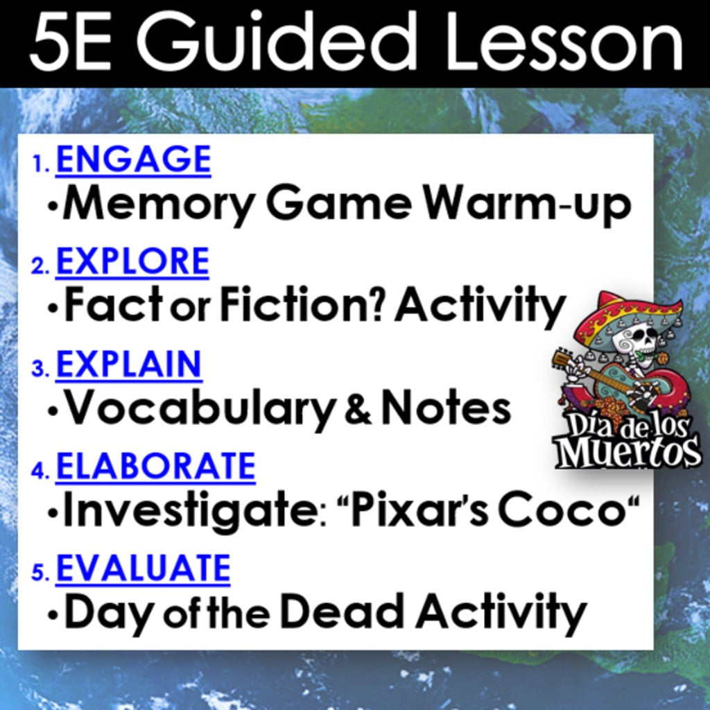This lesson explores the rich traditions of Mexico's Día de Los Muertos, or Day of the Dead, and connects the holiday to Pixar’s movie, *Coco*. The activities are engaging for students, and the guided 5-E format is easy for you to use! Everything you need is included!