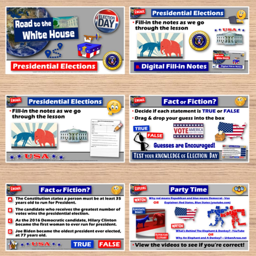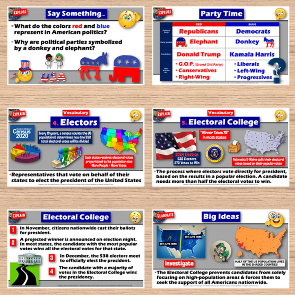 Begin with a fun "Fact or Fiction?" warm-up activity to test students' knowledge of Election Day. Explore different U.S. political parties, followed by an introduction to vocabulary and key concepts. Fill-in notes accompany the lesson. Next, delve into the reasons for establishing the Electoral College system and discuss how the U.S. president is elected. Finally, students will be challenged to create an electoral map that showcases the results of the 2024 U.S. presidential election.