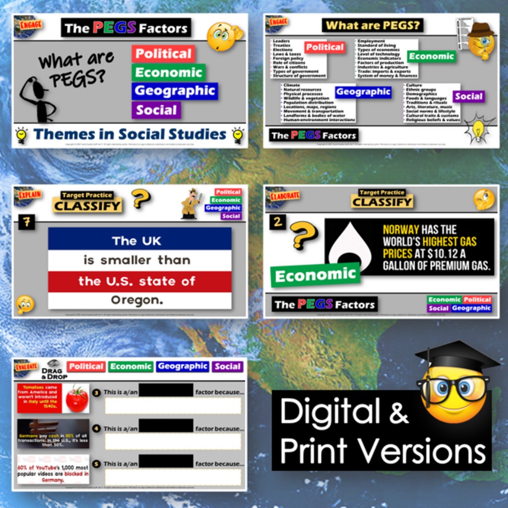 The PEGS factors are common themes that unite all Social Studies classes, regardless of the changing topics of study each year. Building a strong foundation with the PEGS Factors facilitates vertical alignment and enhances student success across grade levels.