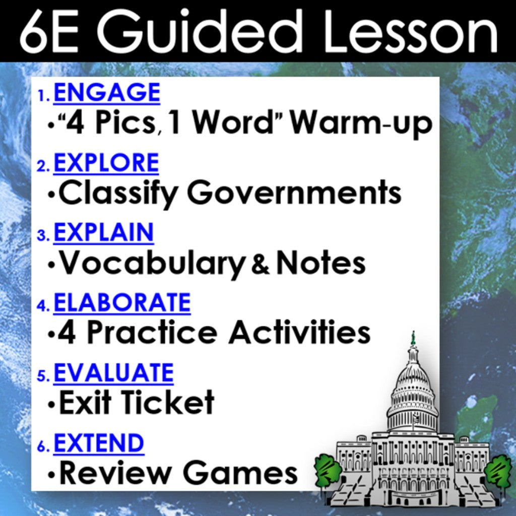 This lesson examines and compares various forms of government found around the world. The activities are engaging for students, and the guided 6-E format is easy for you to use! Everything you need is included!