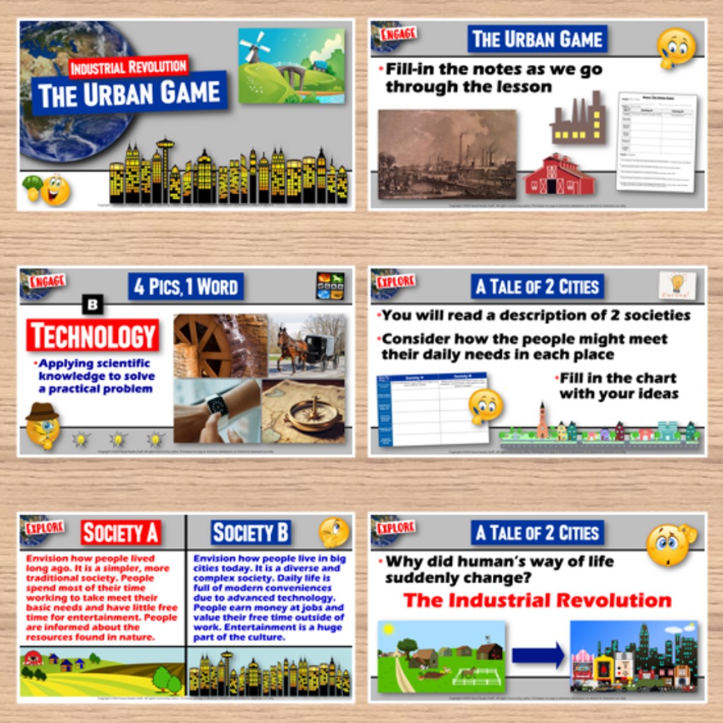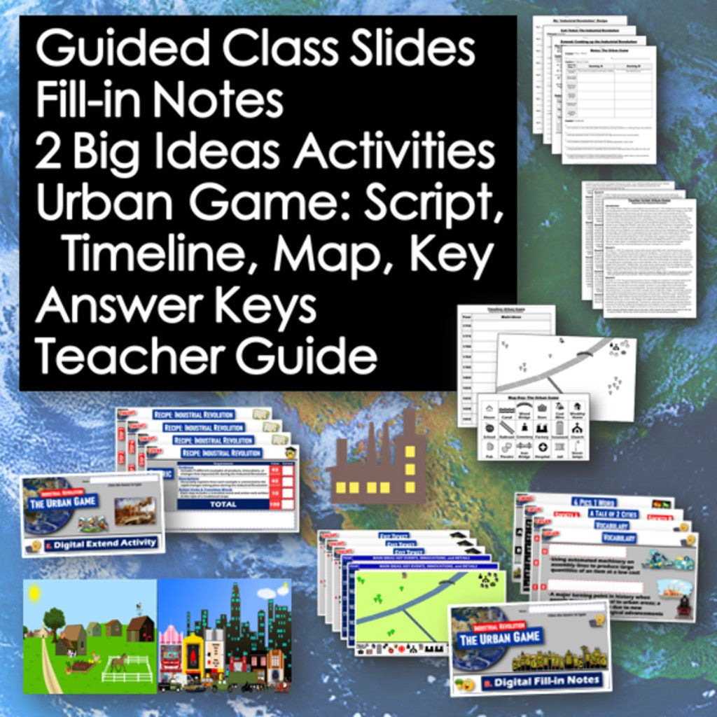 Begin with a fun “4 Pics, 1 Word” warm-up activity, then discuss vocabulary and major concepts. Fill-in notes accompany the lesson. Next, guide your class through “The Urban Game.” In this fast-paced activity, students draw villages and observe their transformations from rural areas into industrialized urban cities over 100 years. They discover the innovations of this time and understand the impact these inventions had on people's daily lives. The experiential activity simplifies the causes and effects of urbanization and industrialization in a meaningful way. Finally, assess student learning with an exit ticket and big ideas activity.
