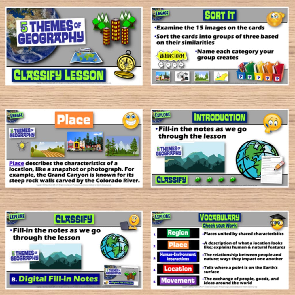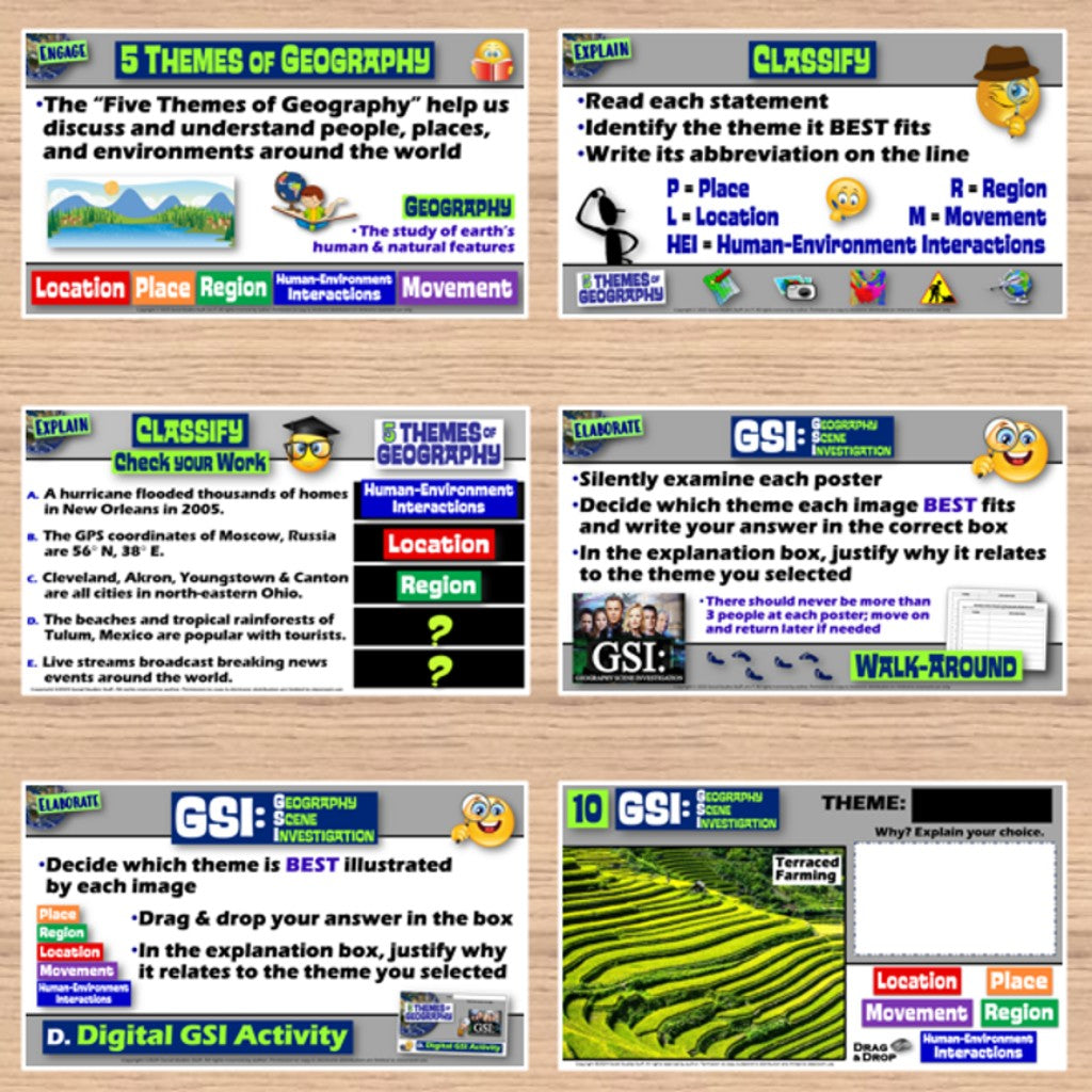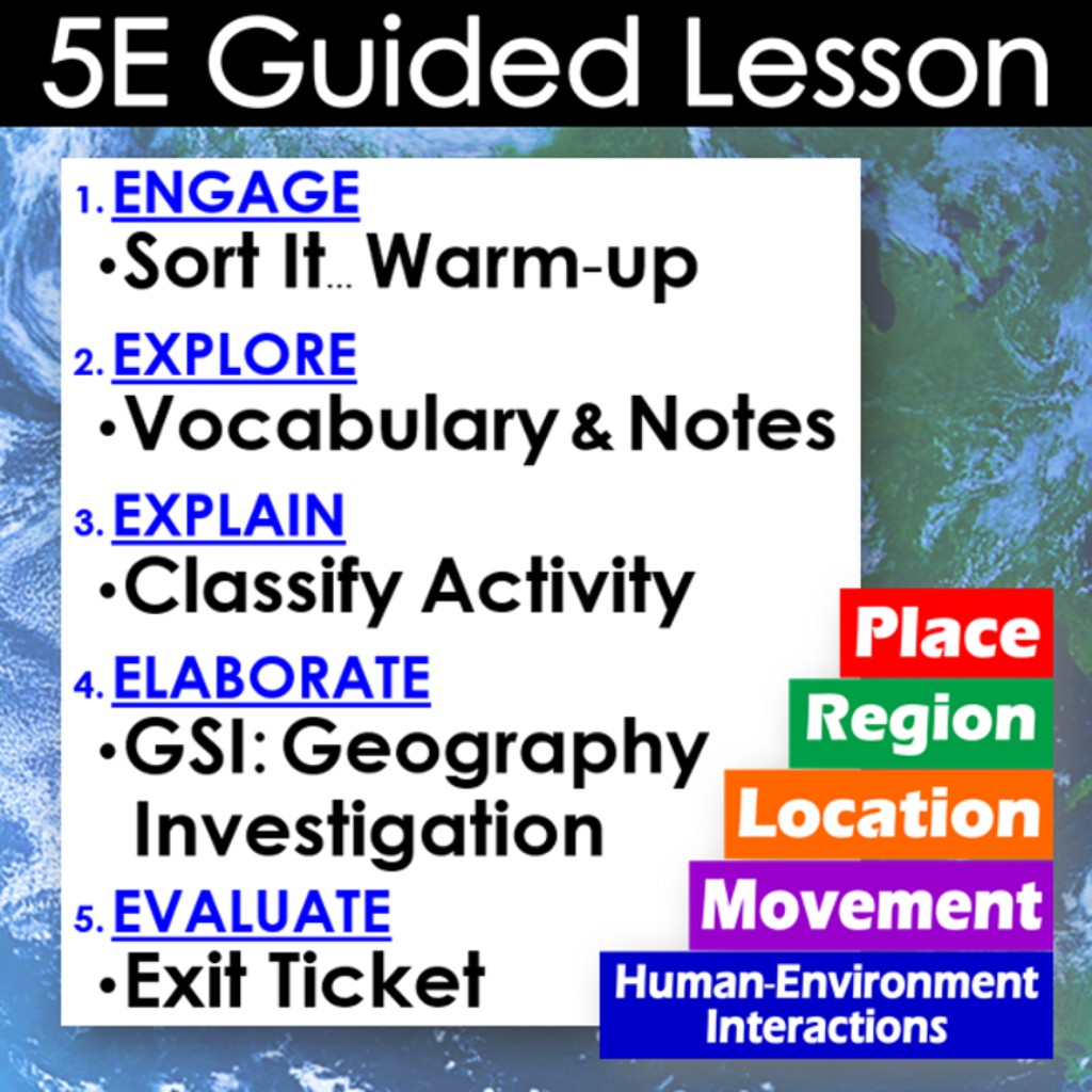 This Five Themes of Geography lesson challenges your class to identify, classify, and explain each theme using real-world examples. The activities are engaging for students, and the guided 5-E format is easy for you to use! Everything you need is included!