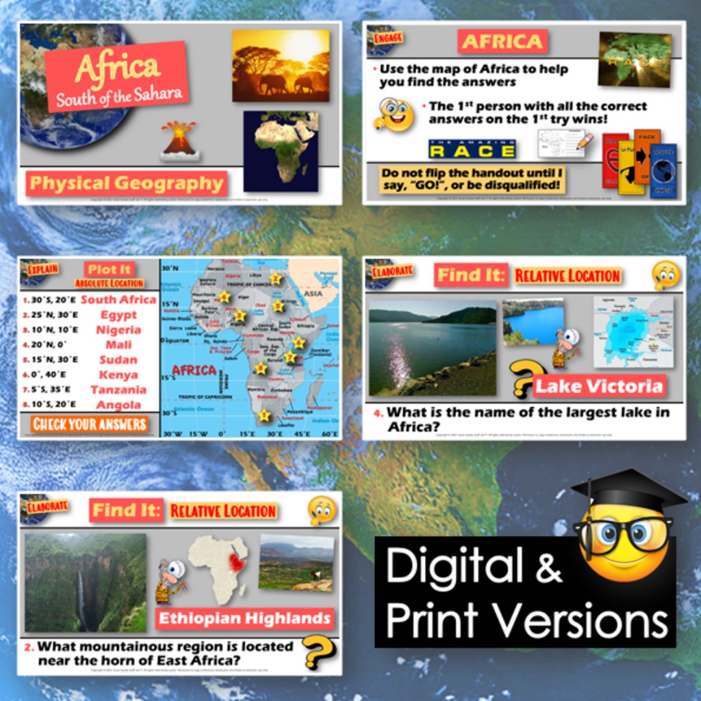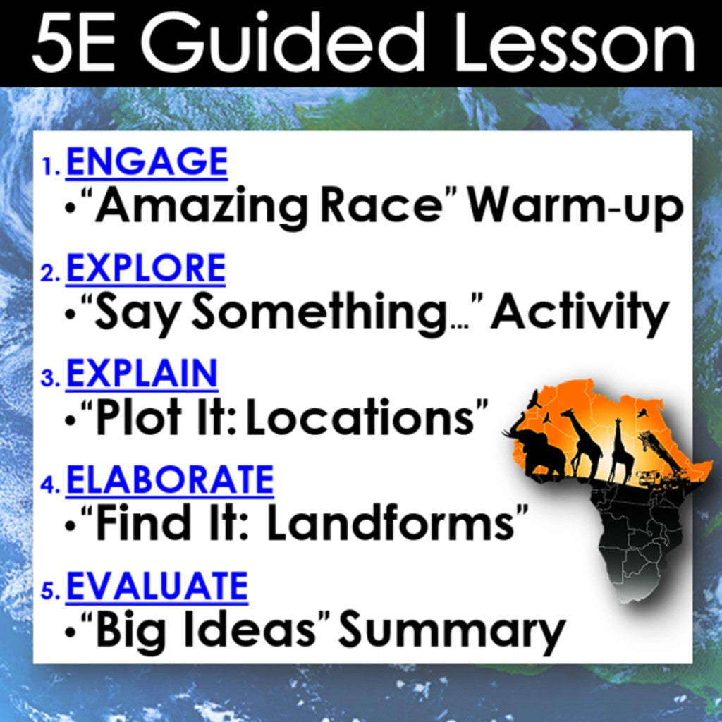 This lesson on African geography, landforms, and places explores the continent's physical features. The activities are engaging for students, and the guided 5-E format is easy for you to use! Everything you need is included!