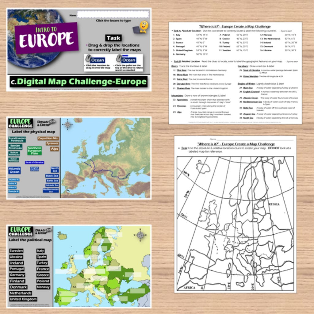 First, students create a map of Europe using only absolute & relative location clues – NO reference maps are needed! Then, they examine various physical and political maps to solve clues about European geography. Finally, a drag-and-drop challenge assesses their learning of the countries, landforms, and bodies of water located on the continent.