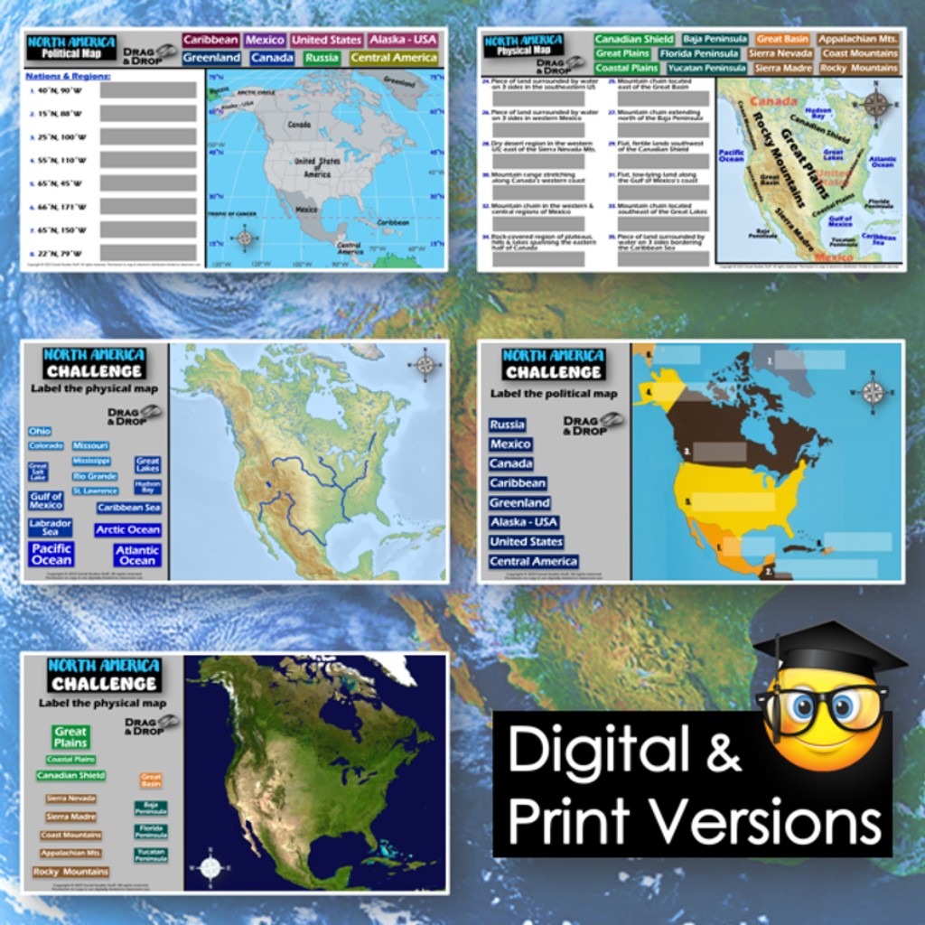 First, students create a map of North America using only absolute & relative location clues – NO reference maps are needed! Then, they examine various physical and political maps to solve clues about North American geography. Finally, a drag-and-drop challenge assesses their learning of the countries, landforms, and bodies of water located on the continent.