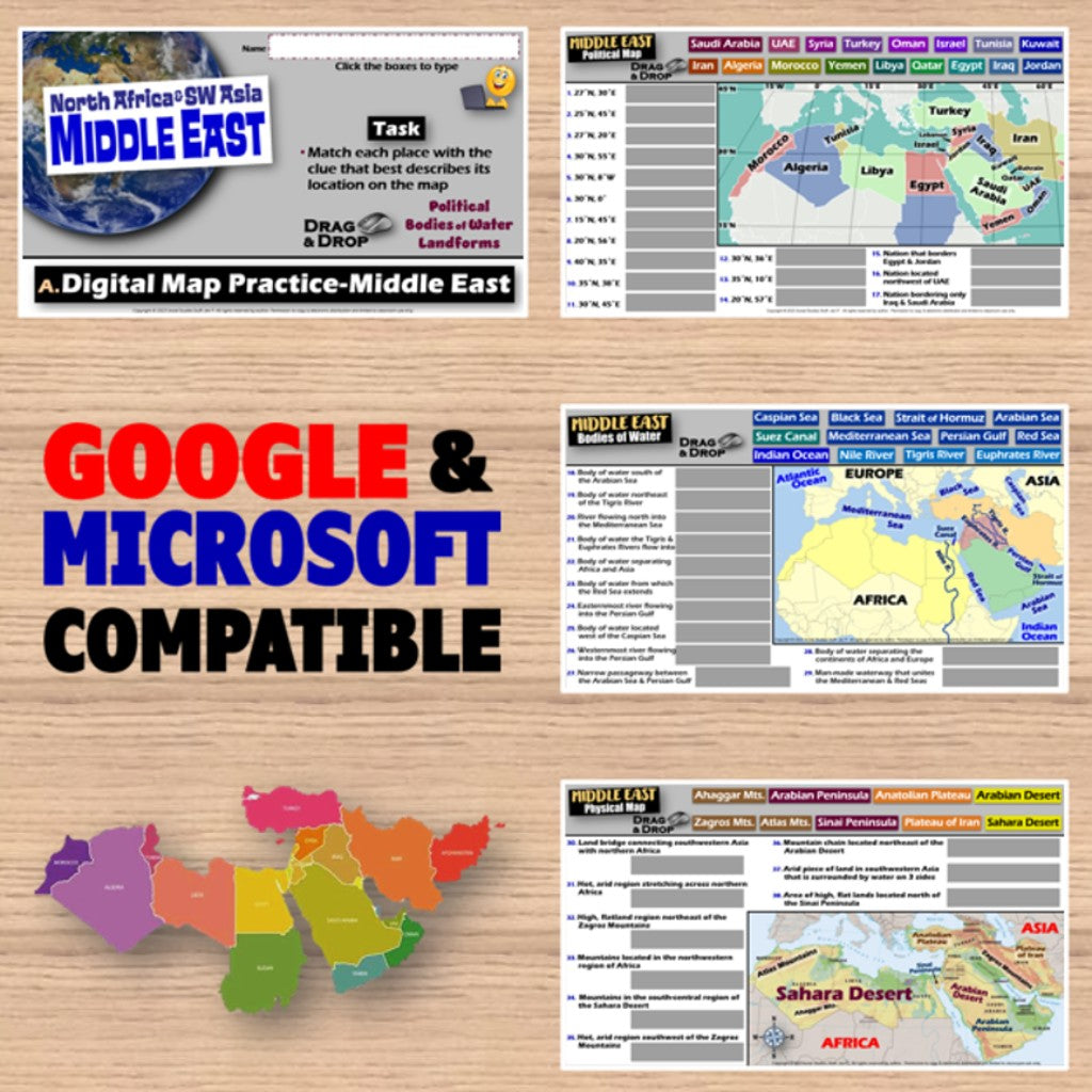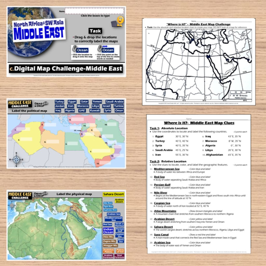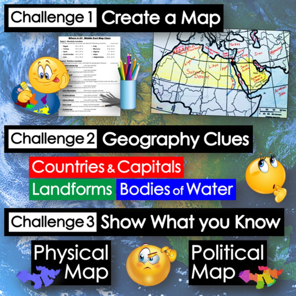 First, students create a map of SW Asia and North Africa using only absolute & relative location clues – NO reference maps are needed! Then, they examine various physical and political maps to solve clues about the geography of the Middle East. Finally, a drag-and-drop challenge assesses their learning of the countries, landforms, and bodies of water located in the region.