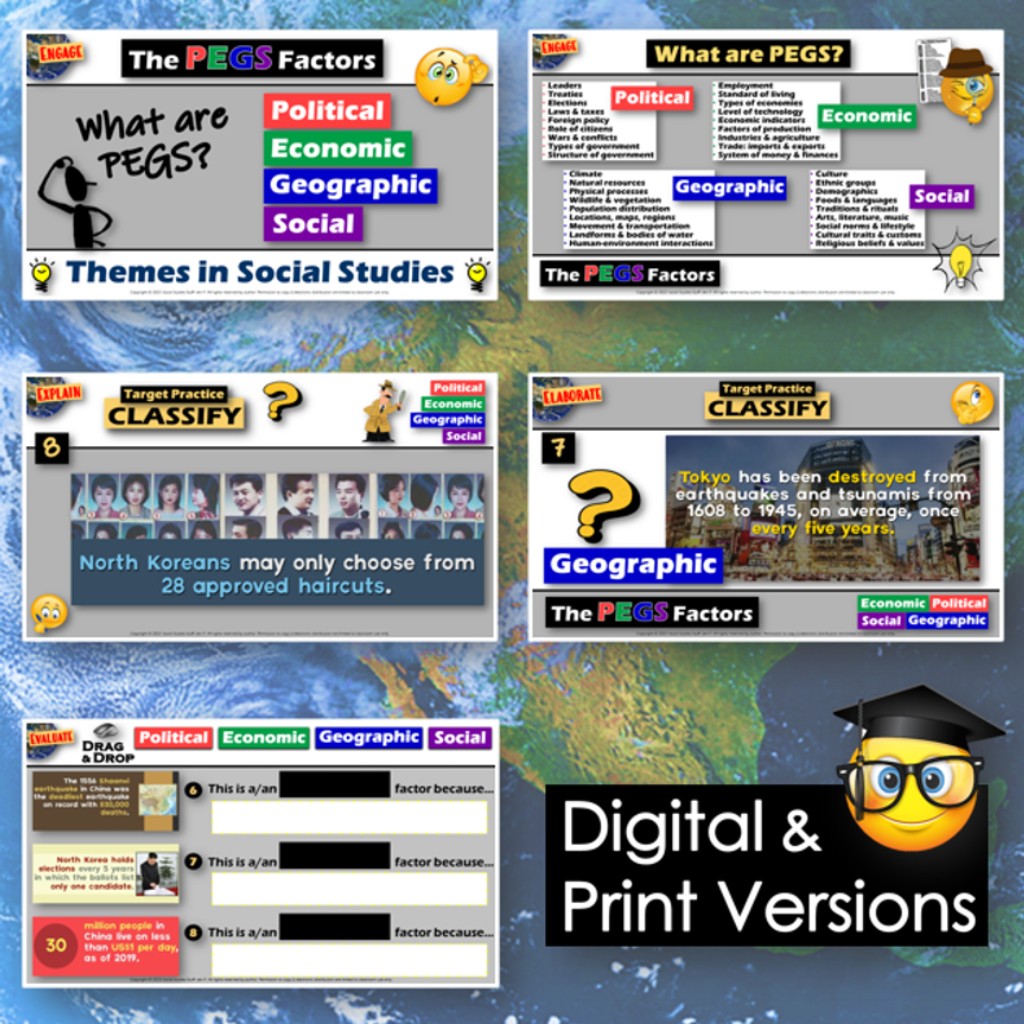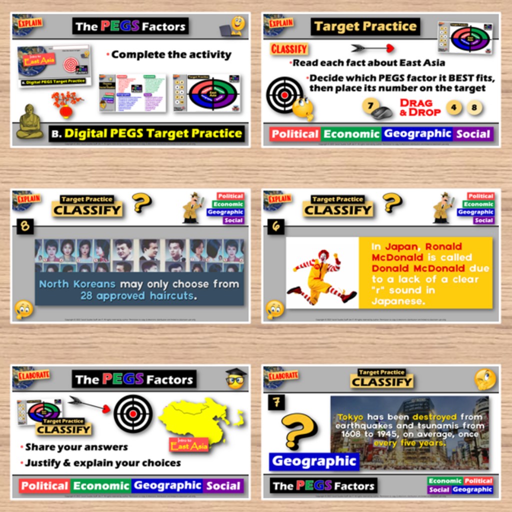 This fun lesson introduces East Asia by exploring its PEGS Factors: Political, Economic, Geographic, and Social. Challenge your students to examine interesting facts about Eastern Asia, then classify each by the PEGS factor it best represents. The activities are engaging for students, and the guided format is easy for you to use! Everything you need is included!