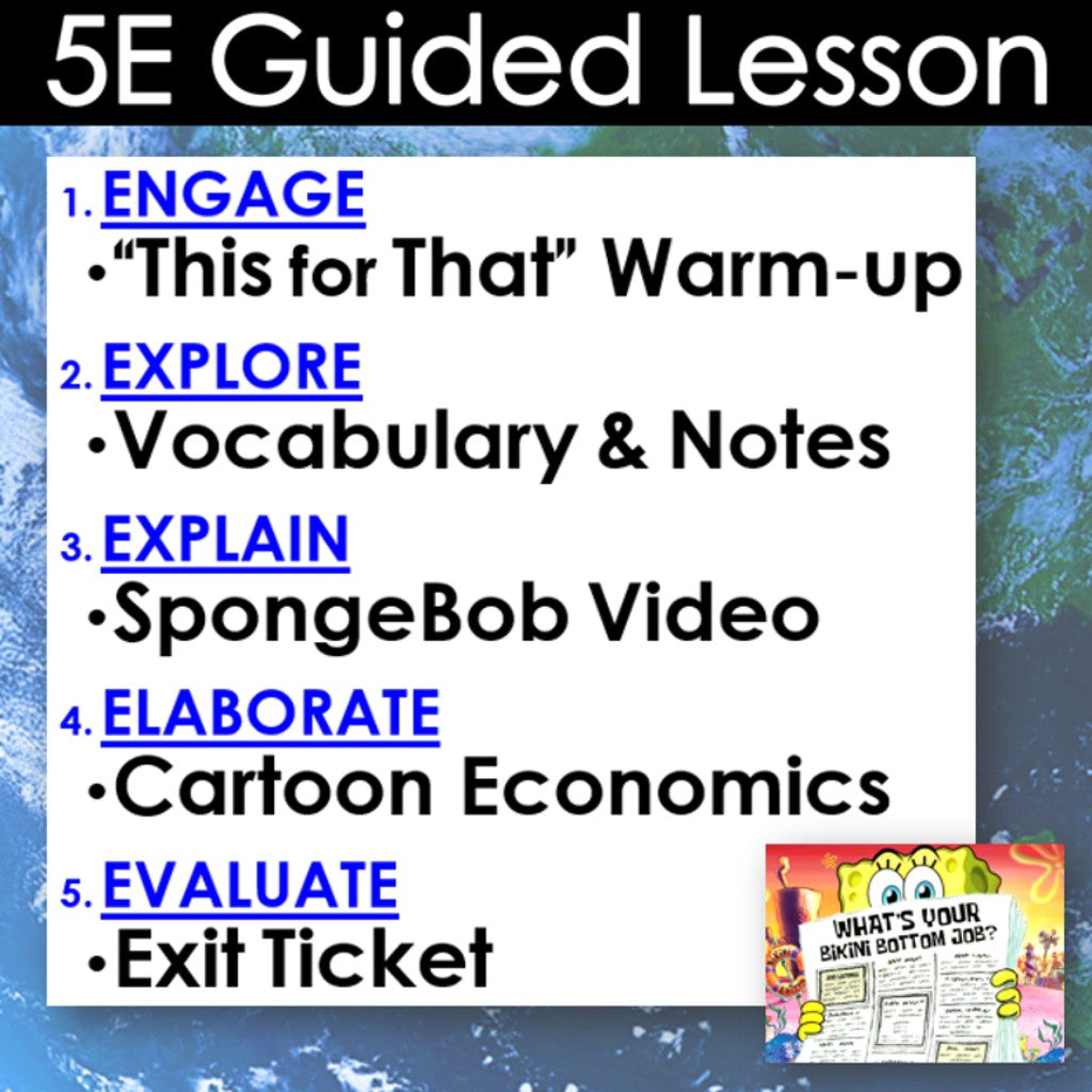 This lesson introduces real-world economics with a fun cartoon case study featuring SpongeBob SquarePants. The activities are engaging for students, and the guided 5-E format is easy for you to use! Everything you need is included!