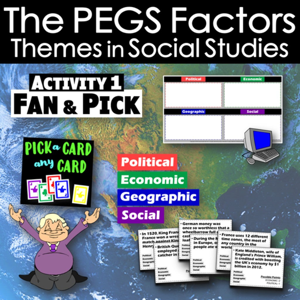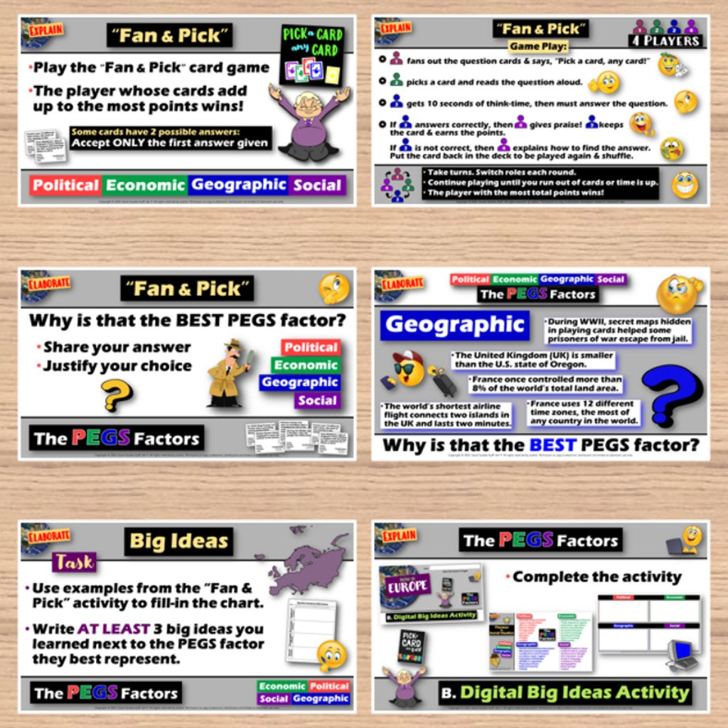 This fun lesson introduces Europe by exploring its PEGS Factors: Political, Economic, Geographic, and Social. A “Fan & Pick” cooperative card game challenges your students to examine and classify facts about Europe by the PEGS factor each best represents. Then, check for understanding with a “Show What You Know” practice activity. The materials are engaging for students, and the guided format is easy for you to use! Everything you need is included!