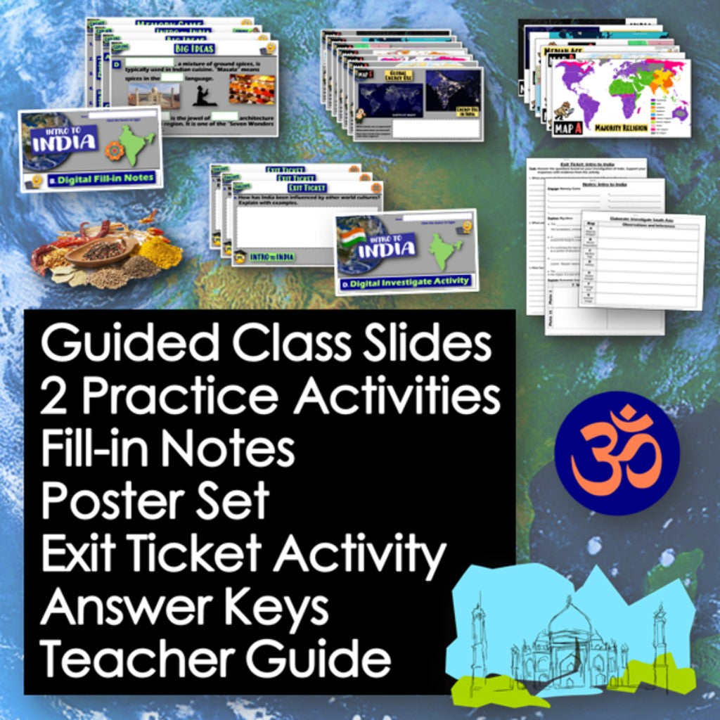 Begin with a fun “Memory Game” warm-up, then explore vocabulary and big ideas about the South Asian region. Fill-in notes accompany the lesson. Next, lead an “ESI: Economic Scene Investigation” to examine economic disparity in modern-day India, then challenge students to draw conclusions about India’s past and present with a map investigation activity. A printable “walk-around” poster version is also included for in-class instruction. Finally, assess learning with a “Big Ideas” exit ticket activity.
