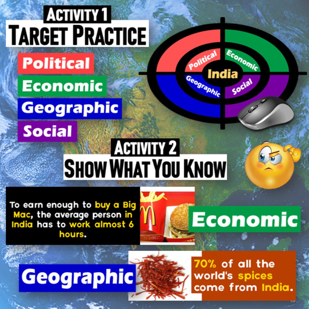 This fun lesson introduces India by exploring its PEGS Factors: Political, Economic, Geographic, and Social. Challenge your students to examine interesting facts about South Asia, then classify each by the PEGS factor it best represents. The activities are engaging for students, and the guided format is easy for you to use! Everything you need is included!