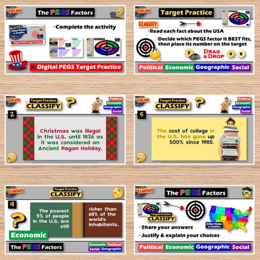 This fun lesson explores the United States by studying its PEGS Factors: Political, Economic, Geographic, and Social. Challenge your students to examine interesting facts about the United States, then classify each by the PEGS factor it best represents. The activities are engaging for students, and the guided format is easy for you to use! Everything you need is included!
