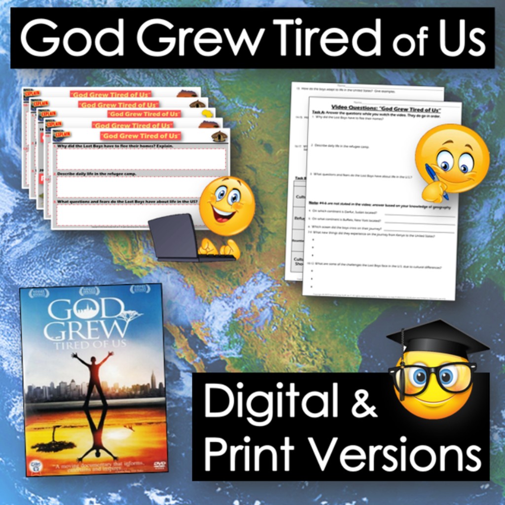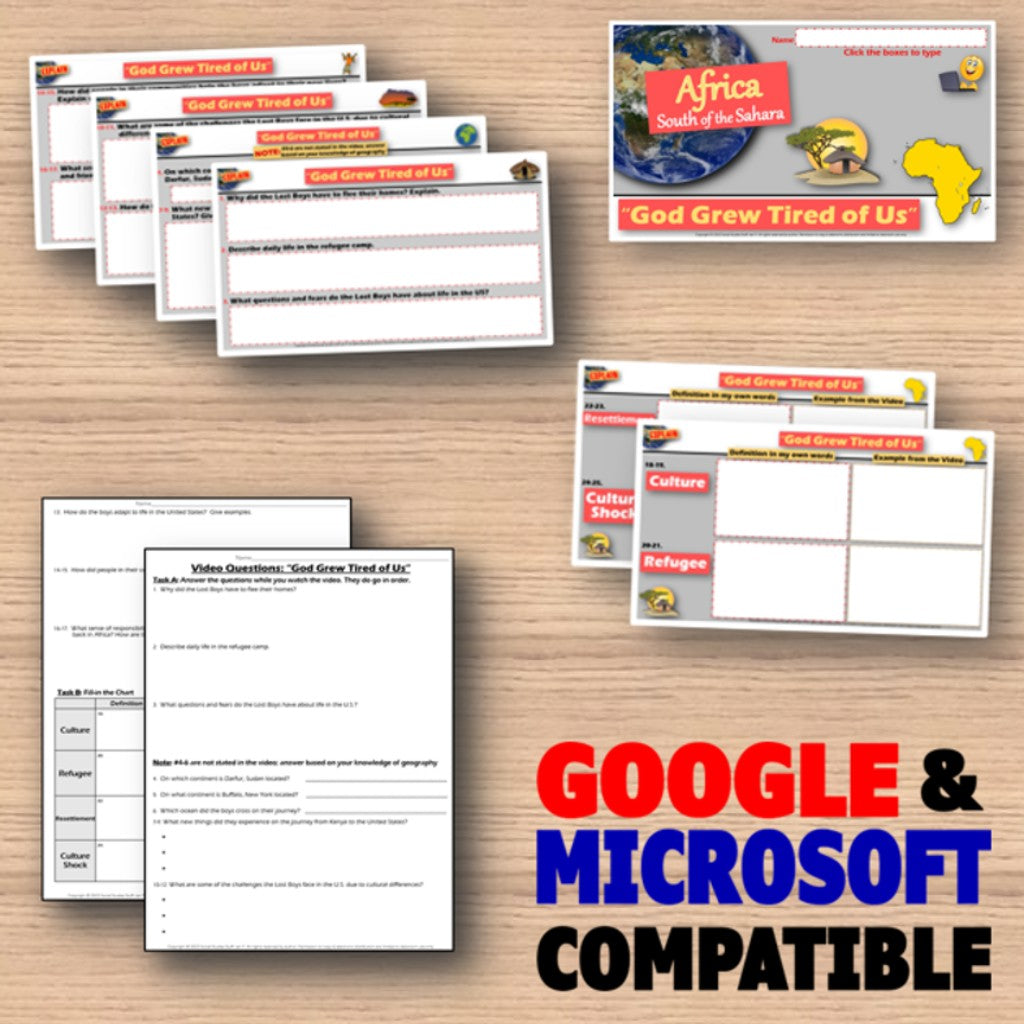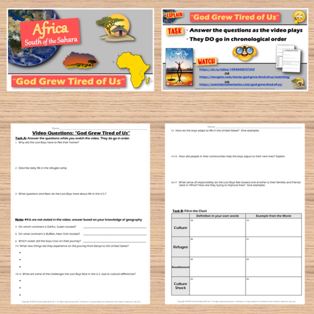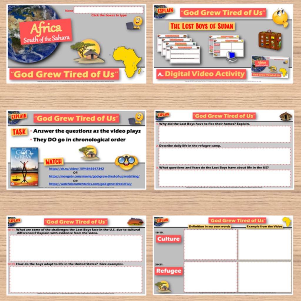 These video questions are designed to accompany the documentary film, "God Grew Tired of Us." This film focuses on focuses on the young refugees from Sudan, Africa, known as the Lost Boys. The video highlights the Lost Boys' experiences during the war, daily life within African refugee camps, and resettlement to cities across the United States. Your students will be captivated by the challenges they faced as they adjusted to life in a new culture, all while learning about the genocide in Darfur and the civil war in Sudan. As students watch the film, they will answer 30 questions that cover the heartwarming stories of these boys. The activity is engaging for students, and the guided format is easy for you to use! Everything you need is included!