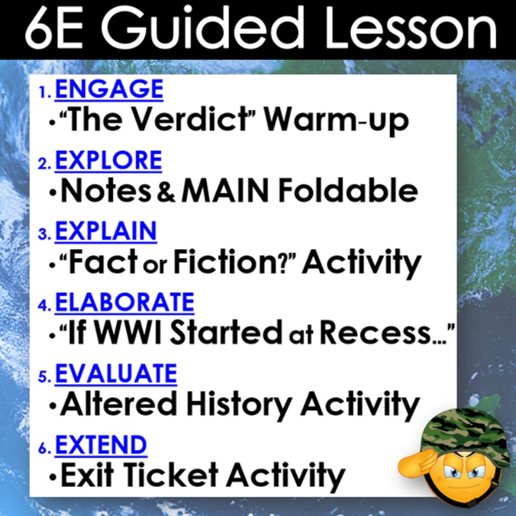 This lesson explores why WWI happened by examining the MAIN causes: Militarism, Alliances, Imperialism, and Nationalism. The activities are engaging for students, and the guided 6-E format is easy for you to use! Everything you need is included!