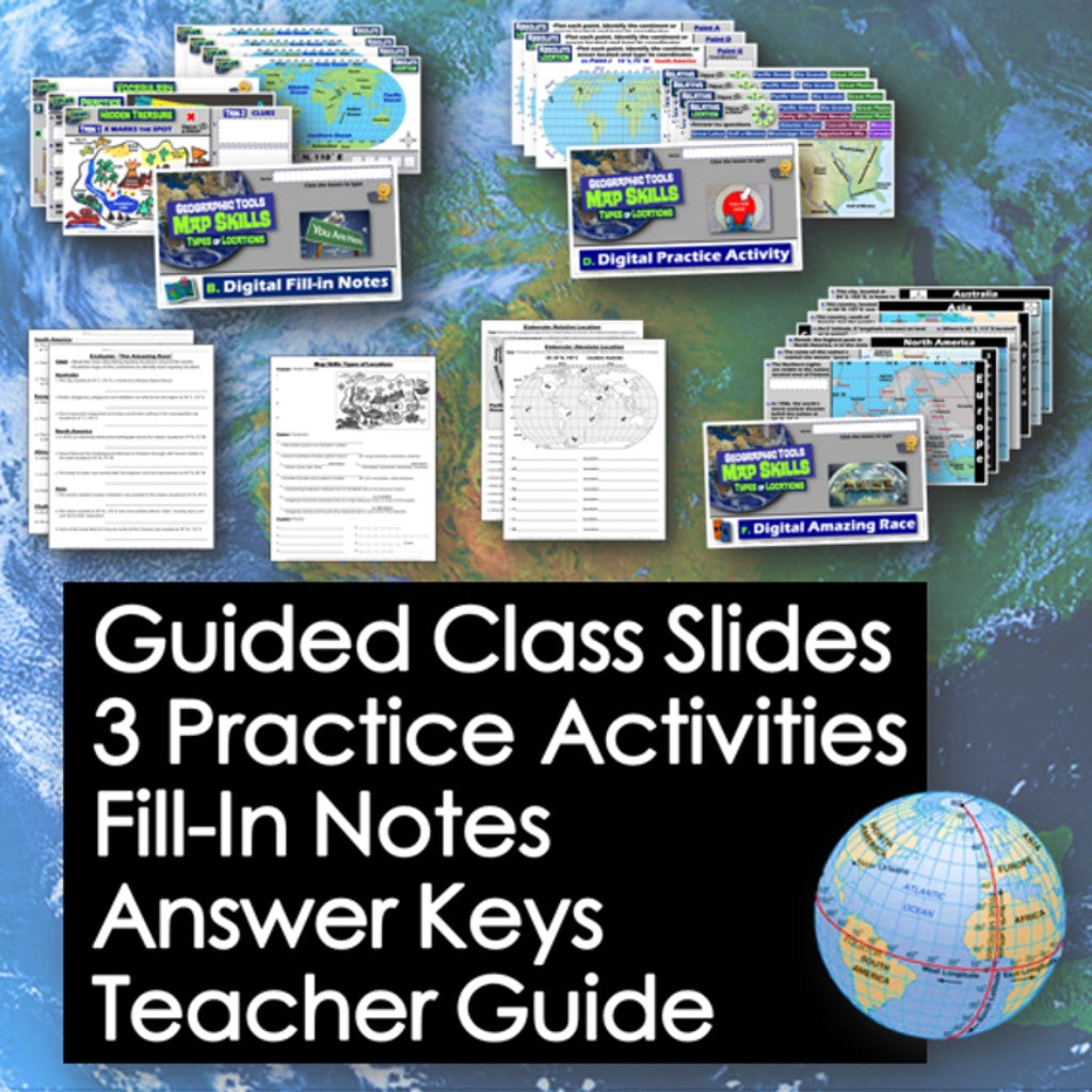 Start with a fun “Hidden Treasure” warm-up, then introduce key concepts and vocabulary. Fill-in notes accompany the lesson. Next, “Show What You Know” lets students practice identifying relative and absolute locations on real-world maps. Finally, assess learning by challenging your class to complete “The Amazing Race” map activity.