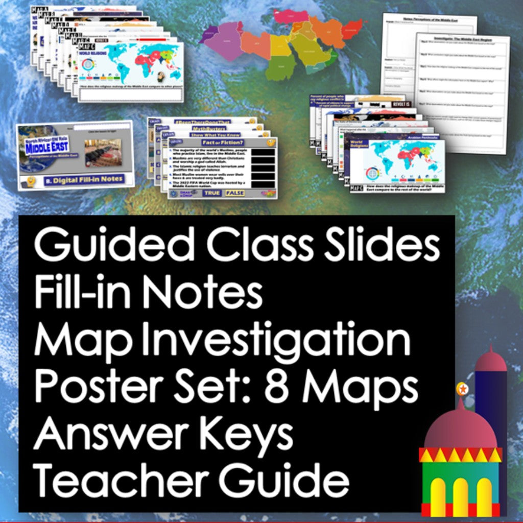 Start with a fun “Hashtags” warm-up to assess students' prior knowledge of the region. Next, students challenge stereotypes about the Middle East through a “Fact or Fiction?” activity, followed by a critical thinking activity to clarify misconceptions. Fill-in notes accompany the lesson. Next, challenge your class to investigate and analyze “8 Maps that Explain the Middle East”. A printable “walk-around” poster version for in-class instruction is also included. Finally, assess learning with a “MythBusters” summary activity.