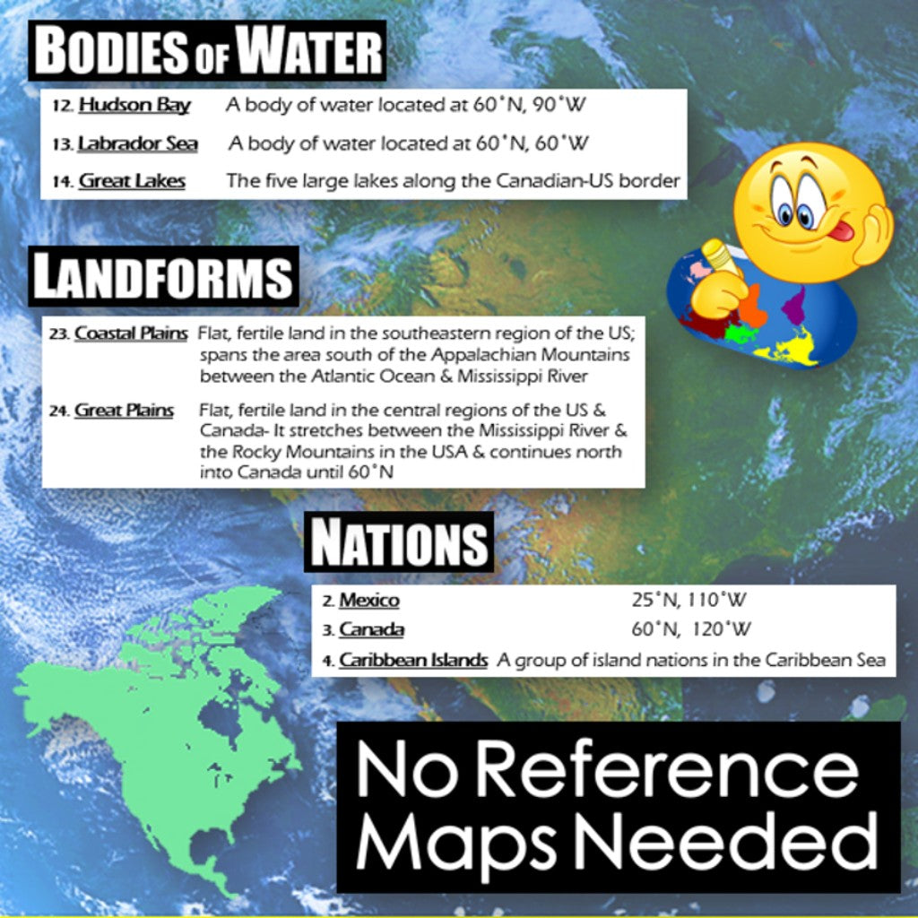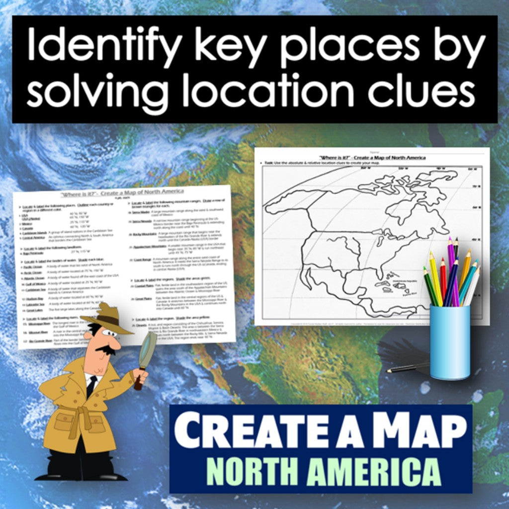 Take map-making to the next level and end the cycle of bored students copying from a book to label maps! Challenge your class to think critically and create a map of North America by solving absolute and relative location clues - NO reference maps needed! Easy-to-follow directions make this a fun way to integrate mapping in your classroom! Everything you need is included!
