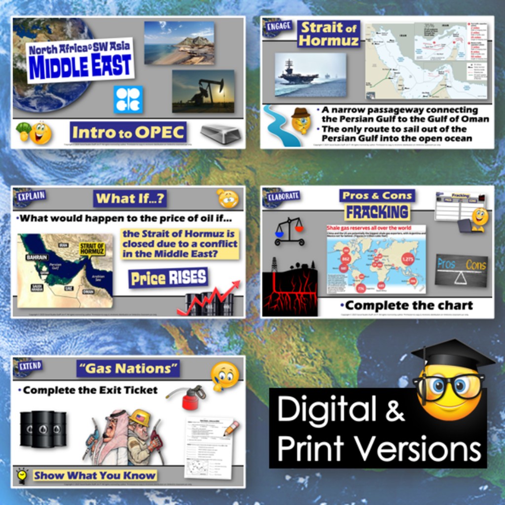 This lesson explores the influence of OPEC and the impact of globalization on the world's oil supply. It examines how reserves in the Persian Gulf region, along with fracking in the United States, affect the price of oil globally. The activities are engaging for students, and the guided 6-E format is easy for you to use! Everything you need is included!