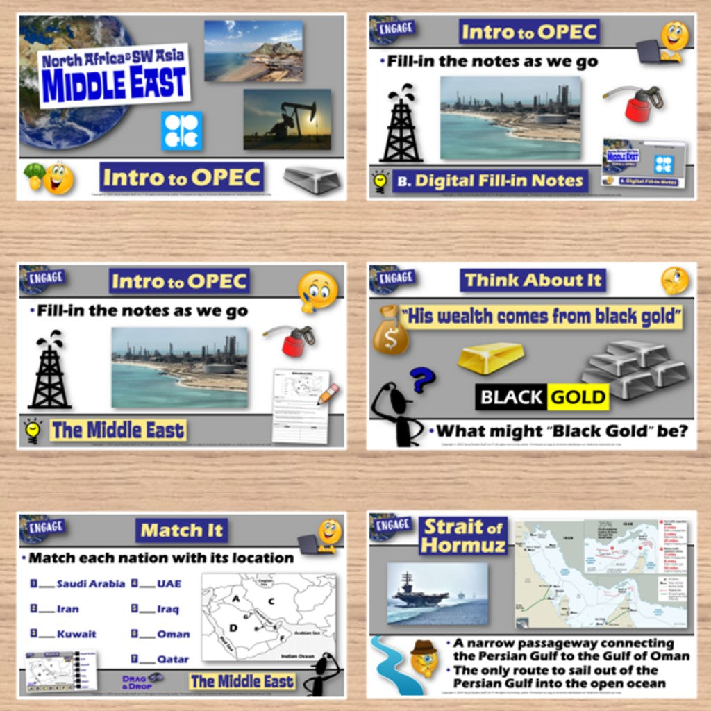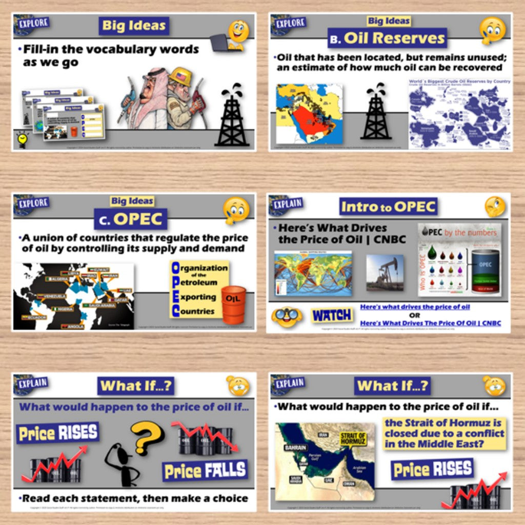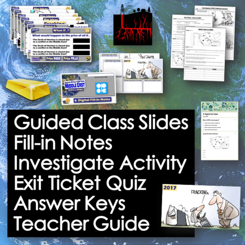 Begin with a “Match It” map warm-up to review the Middle East, followed by an introduction to vocabulary and key concepts. Fill-in notes accompany the lesson. A “What If...?” activity explains how the price of oil is determined by the balance of supply and demand. Next, students investigate the positive and negative effects of oil fracking and analyze political cartoons about OPEC. Finally, assess learning with an exit ticket quiz.