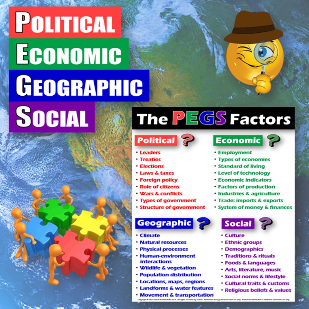 Social Studies curricula can change significantly from year to year, but the PEGS factors serve as common themes that unite all Social Studies classes. These ideas are similar to the concepts of PESTLE, STEEP, or PEST. Establishing a strong foundation with these concepts promotes vertical alignment across grade levels. Utilize PEGS resources throughout the year to enhance your curriculum!