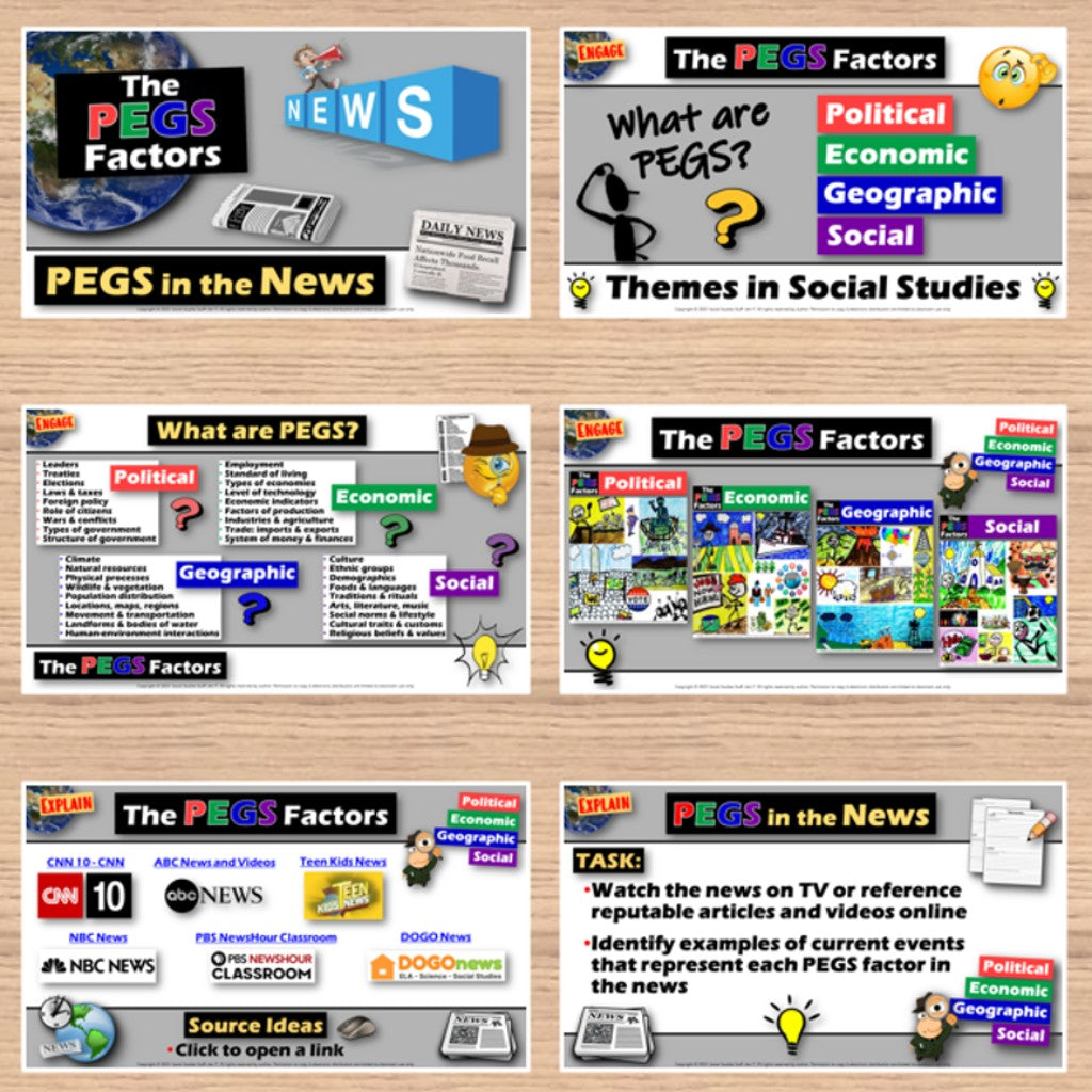 Encourage students to follow current events and discover real-world examples of PEGS (Political, Economic, Geographic, Social) factors reported in the news. Social Studies curricula can change significantly from year to year, but the PEGS factors serve as common themes that unite all Social Studies classes. The activity is engaging for students, and the guided format is easy for you to use! Everything you need is included!