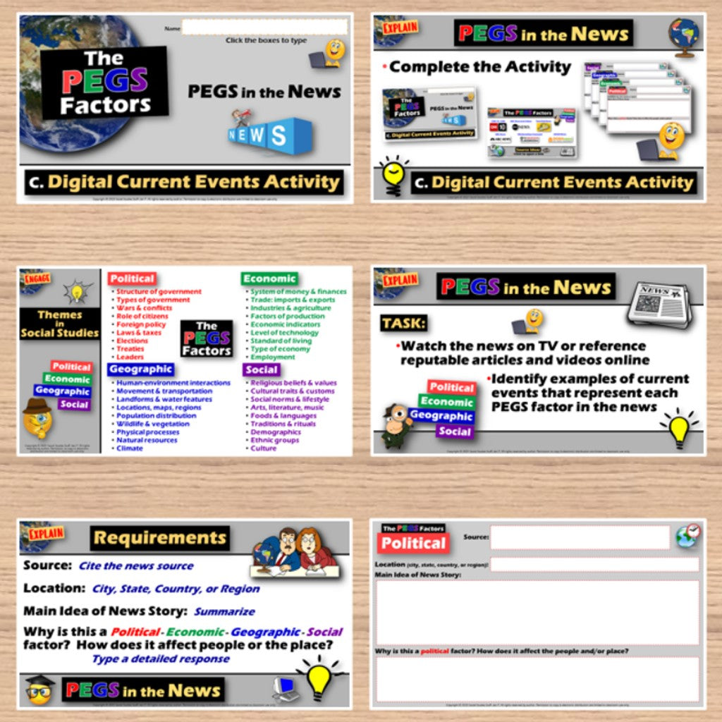 Students will watch or read news stories, identify examples that represent each PEGS factor, summarize the main ideas, and justify their selections. Links to websites and a PEGS reference chart for interactive notebooks help guide their research. This activity can be assigned regularly throughout the year, so students can connect the real world to your classroom.