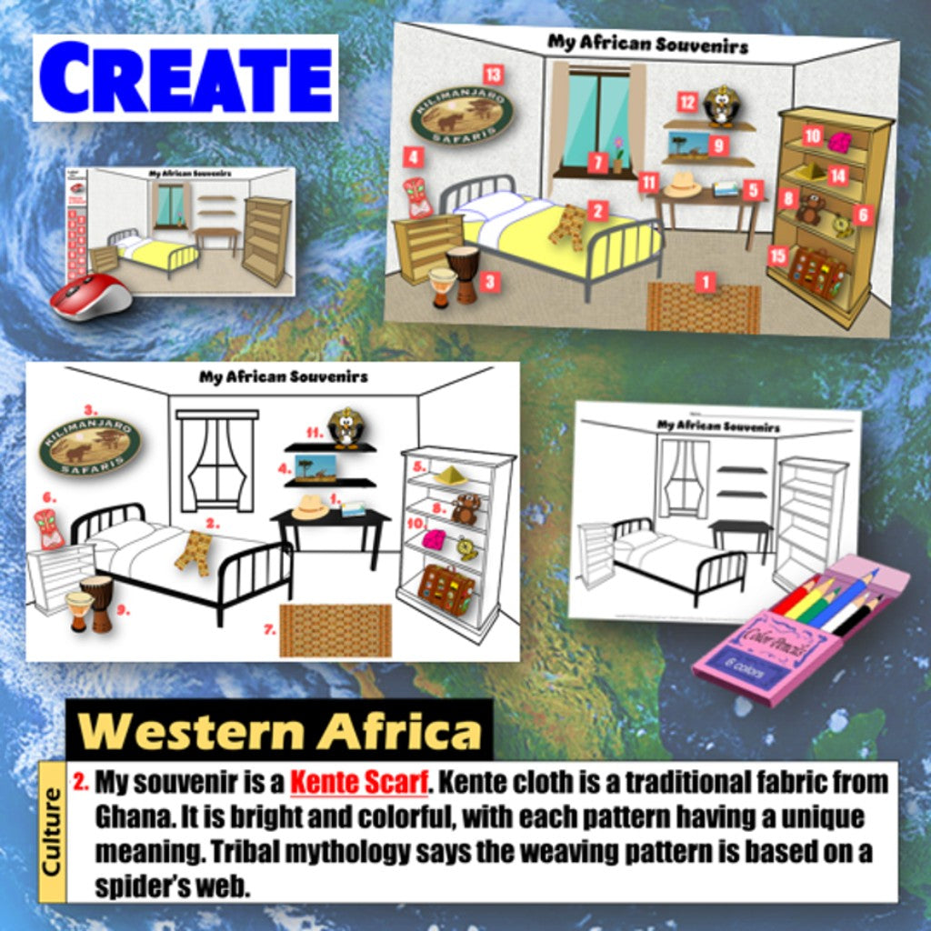 First, a research guide encourages your class to identify and explain various geographical and cultural features of each African region. Then, students create unique souvenirs to represent each region based on their research. They write descriptions to explain each souvenir’s connection to African culture or geography. Finally, they decorate bedroom templates to exhibit their African souvenirs. A fill-in rubric sets clear expectations and makes grading easy! “My Souvenirs of Africa” projects are always creative, thoughtful, and look fantastic when displayed!