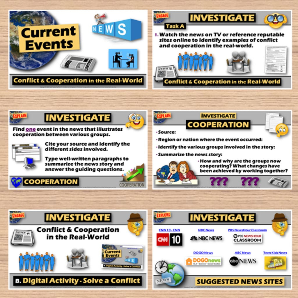 First, students watch or read the news to identify current examples of conflict and cooperation around the world. Next, they summarize their findings for the UN Security Council and propose innovative solutions for peace. This activity effectively integrates current events with essential research skills in your curriculum. A fill-in rubric makes grading easy.