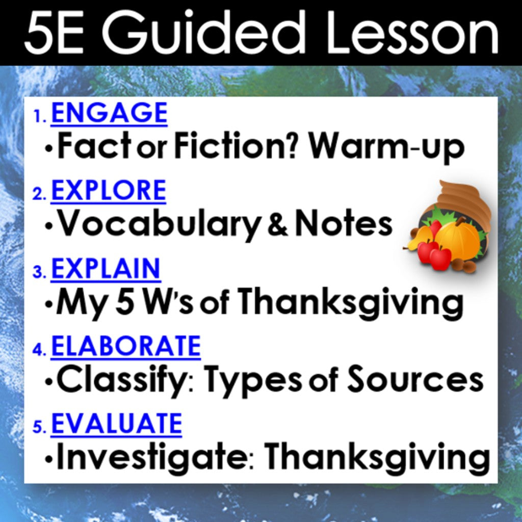 This Thanksgiving lesson examines the holiday’s history and traditions, utilizing primary and secondary sources. The activities are engaging for students, and the guided 5-E format is easy for you to use! Everything you need is included!