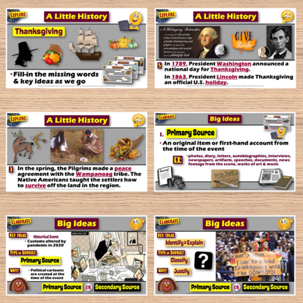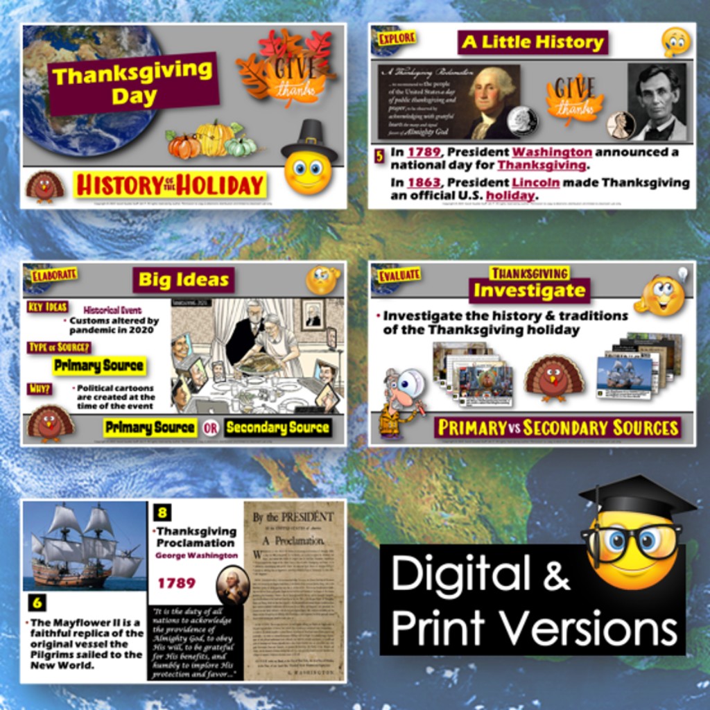 Begin with a fun "Fact or Fiction?" warm-up that tests students' knowledge about Thanksgiving. Then, discuss the origins of the Thanksgiving holiday with "A Little History“ review. Fill-in notes accompany the lesson. A "My 5 W's of Thanksgiving" activity allows students to share their family customs and traditions. Next, a “Big Ideas” review examines identifying differences between primary and secondary sources of information. Finally, an investigation activity challenges your class to examine and classify primary and secondary sources of information related to Thanksgiving. A printable “walk-around” poster set is also included for in-class instruction.