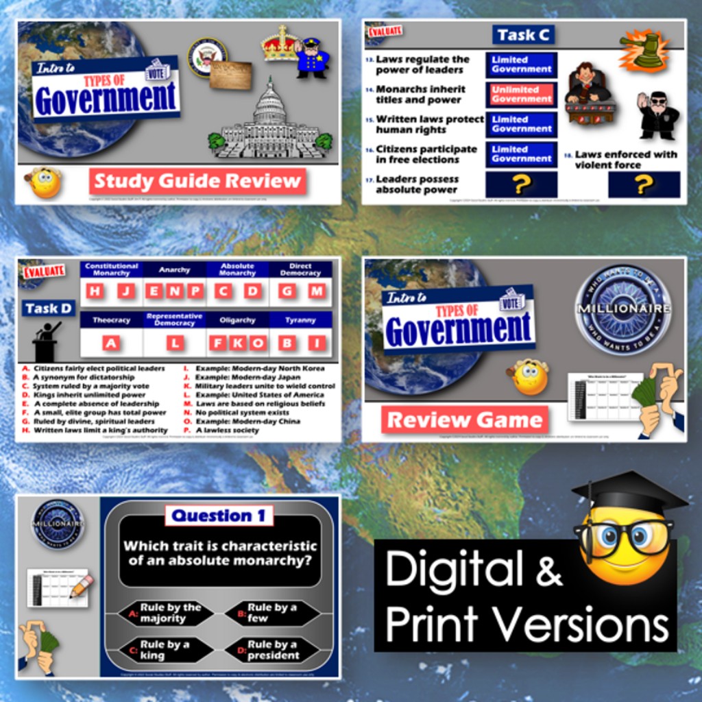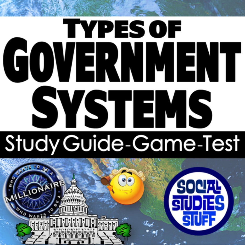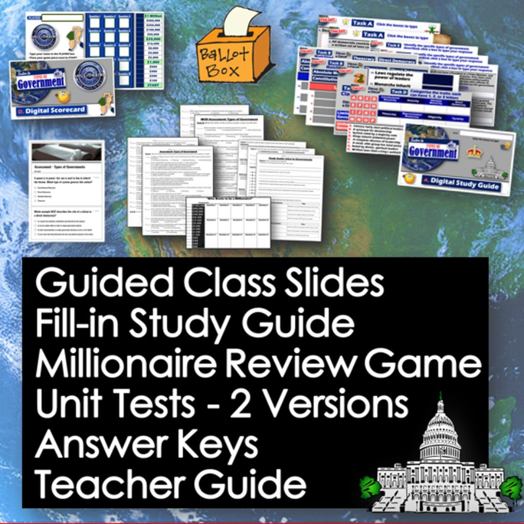 Review and assess a “Types of Governments” unit with this bundle of engaging materials! First, reinforce key concepts with a study guide & review lesson. Then, play a fun “Who Wants to Be a Millionaire” review game with your class. Finally, assess learning with a 25-question, multiple-choice test. Includes 2 versions of the test, on-level & modified, so you can easily differentiate in your classroom. The activities are engaging for students, and the guided format is easy for you to use! Everything you need is included!