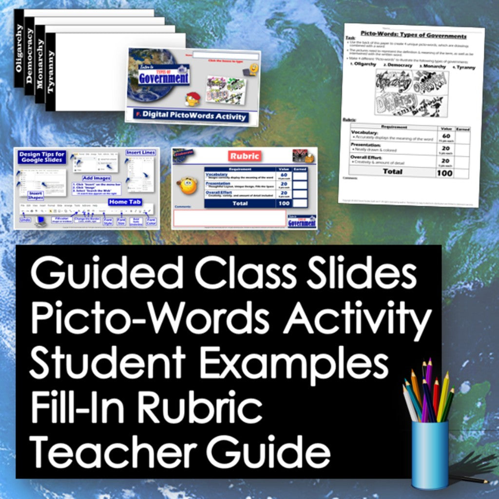 Picto-Words are a fun way to review key vocabulary. Students illustrate the meanings of various types of government by intertwining the word with images. The activity allows students to showcase their creativity while reinforcing their understanding of essential concepts. Guided slides are provided to help explain the activity, and a fill-in rubric simplifies grading. Picto-Words make excellent displays for both the classroom and hallways! The activity is engaging for students, and the guided format is easy for you to use. Everything you need is included!