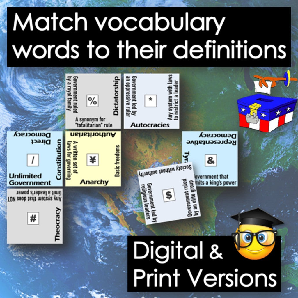 Review and assess an introduction to types of governments with these fun vocabulary puzzles. Challenge students to match 17 vocabulary terms with their definitions by rotating each piece to complete the puzzle. They are engaging for students, and the guided format is easy for you to use! This activity works great as a warm-up, a re-teaching opportunity, an exit ticket, or a review game. Everything you need is provided!