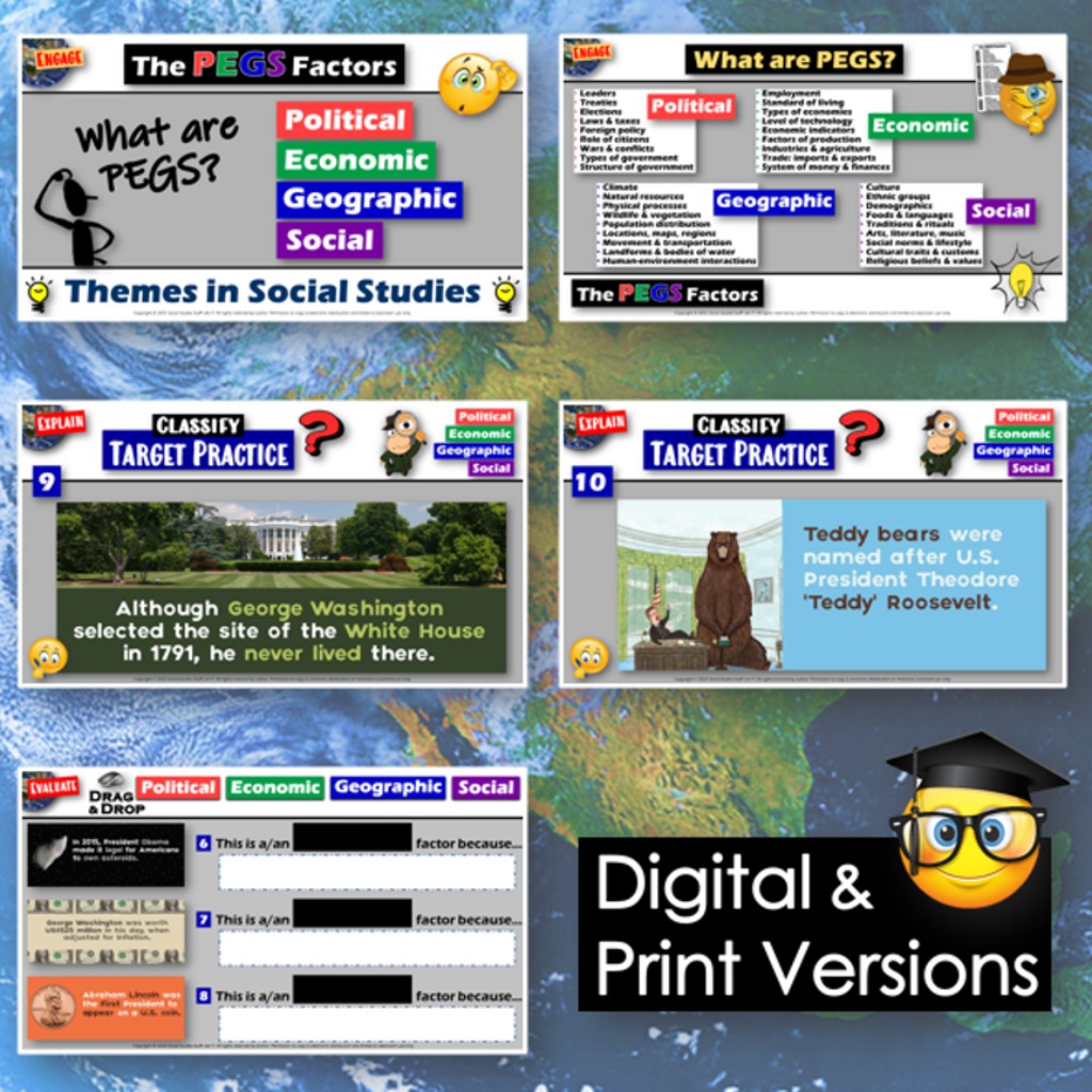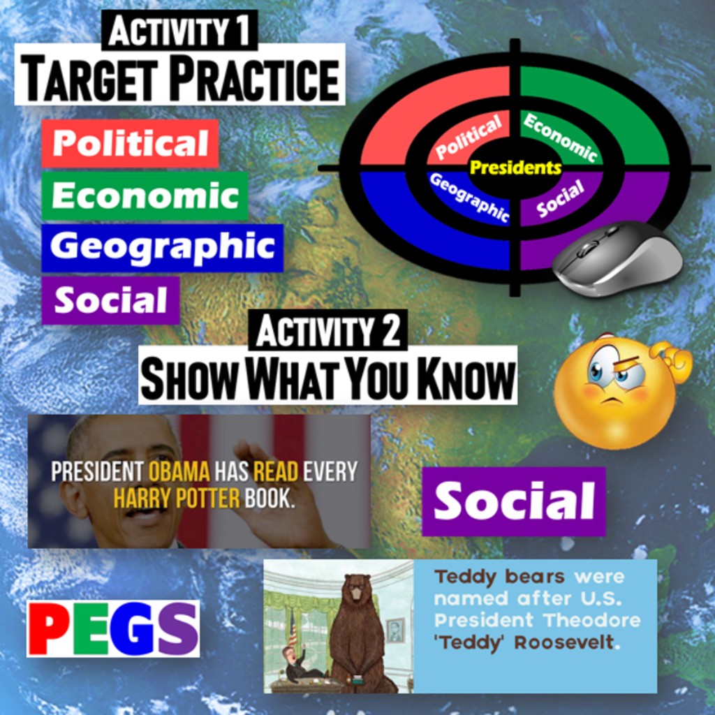 This fun lesson explores U.S. Presidents by exploring the PEGS Factors: Political, Economic, Geographic, and Social. Challenge your students to examine interesting facts about Presidents, then classify each by the PEGS factor it best represents. The activities are engaging for students, and the guided format is easy for you to use! Everything you need is included!