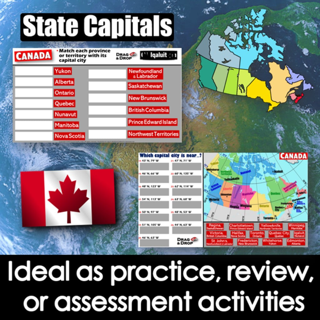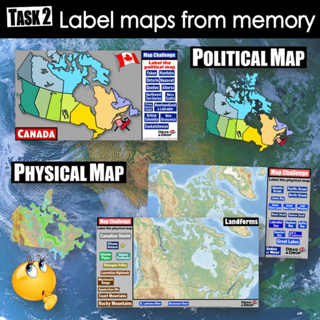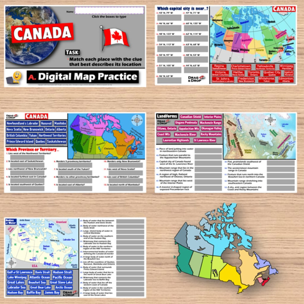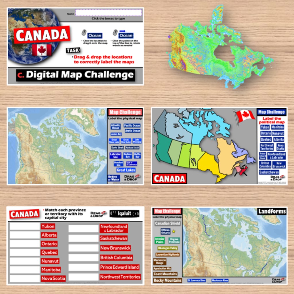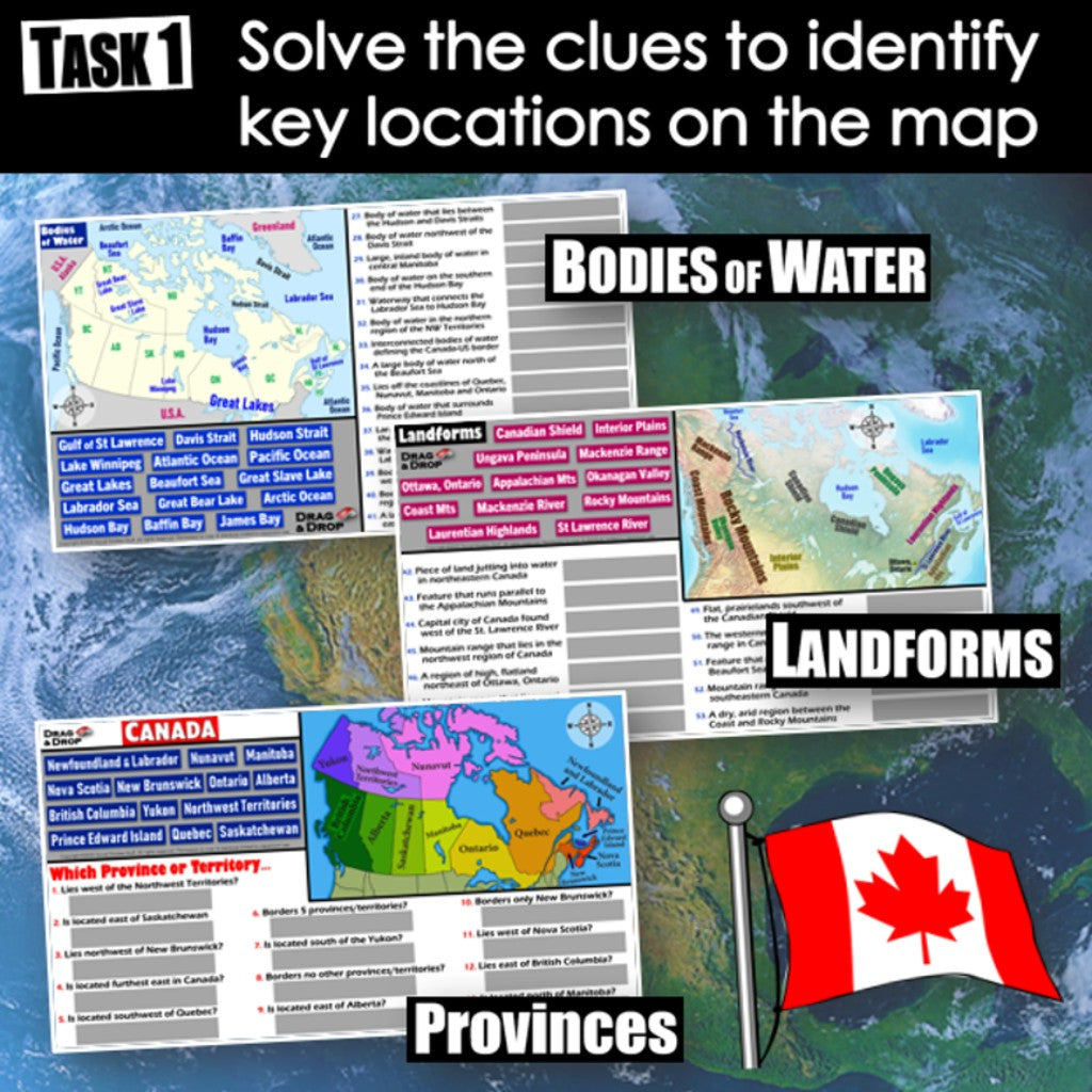 First, students examine various physical and political maps to solve clues about Canada's geography. Then, a drag-and-drop challenge assesses their learning of the provinces, territories, capitals, bodies of water, and landforms. Easy-to-follow directions make these activities a fun way to integrate mapping into your curriculum! Made for traditional in-class learning or digital 1:1 classrooms. Everything you need is included!