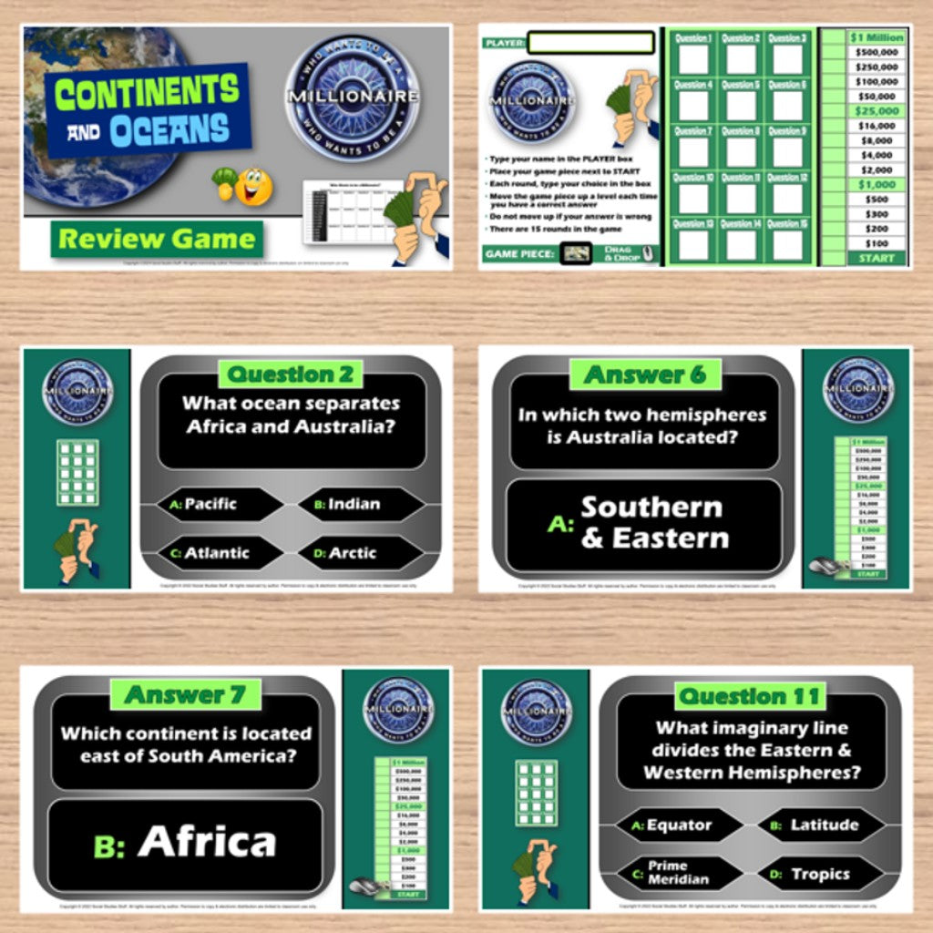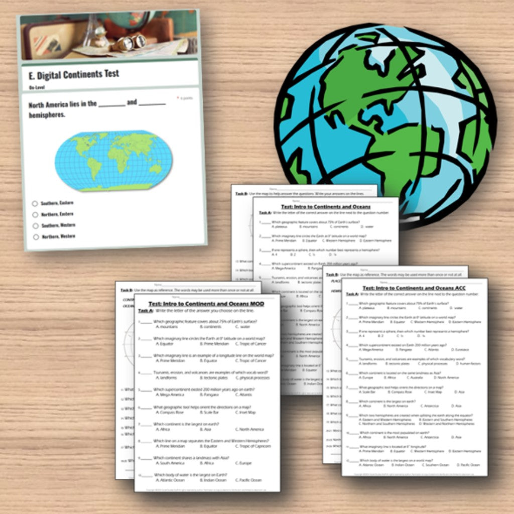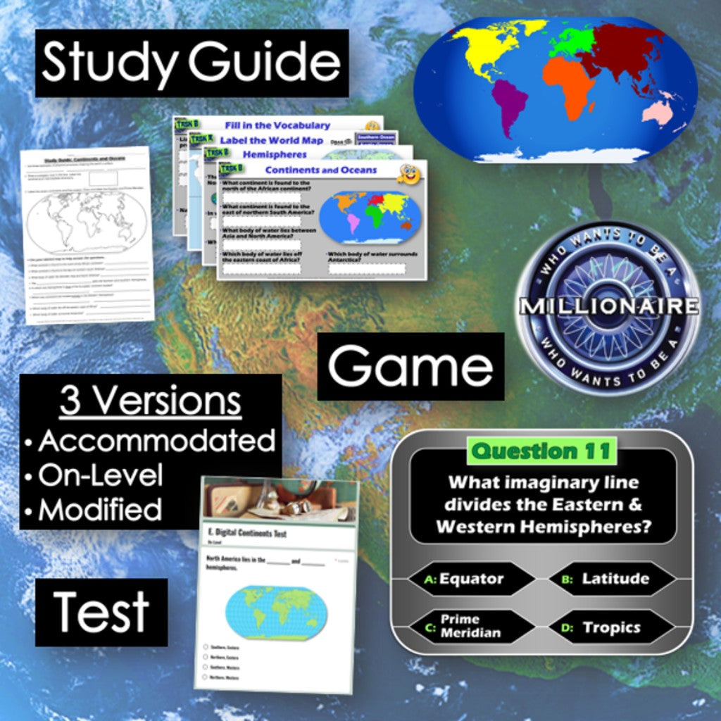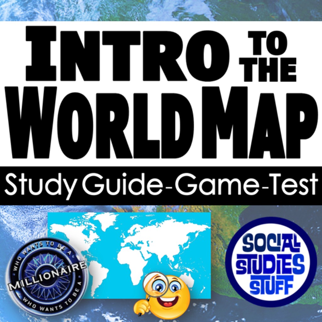Review and assess World Map skills with this bundle of engaging materials! First, reinforce key concepts with a fill-in study guide. Then, play a fun “Who Wants to Be a Millionaire” review game with your class. Finally, assess learning with a 30-question, multiple-choice test. Choose from three versions, on-level, accommodated, and modified, to easily differentiate learning in your classroom. The activities are engaging for students, and the guided format is easy for you to use! Everything you need is included!
